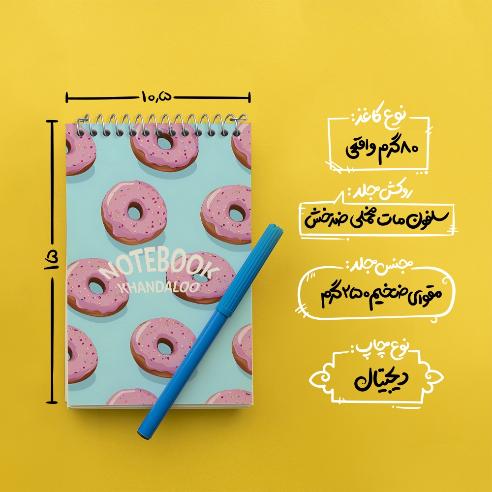 برند خندالو در زمینه تولید انواع دفاتر فانتزی و تحصیلی فعالیت میکند که به دلیل جذابیت ظاهری و طرح های متنوع طرفداران زیادی دارد. دفتر یادداشت خندالو طرح پترن دونات محصولی مناسب برای همه عاشقان لوازم التحریر است و همچنین همه کسانی که بنا به موقعیت تحصیل یا شغلشان با دفتر و نوشت افزار زیاد سر و کار دارند. در تولید دفتر یادداشت خندالو طرح پترن دونات از نوع صحافی فنر مارپیچ استفاده شده که در این نوع صحافی برگهها به راحتی چرخیده و یا بیرون آورده می شوند. دفتر های خندالو دارای جلد انعطاف پذیر از جنس مقوای گلاسه 250 گرم با روکش سلفون مات مخملی است که به شما امکان میدهد از دفتر خود بدون اینکه نگرانی از شکستن یا خراب شدن جلد را داشته باشید استفاده کنید و همچنین در این دفاتر از کاغذ 80 گرم با کیفیت استفاده شده که باعث میشود هنگام نوشتن به خوبی جوهر قلم بر روی صفحه نشسته و از خط خوردگیها جلوگیری کند. دفتر یادداشت خندالو با جنس و دوام مناسب، برگه های کاملاً سفید و خطوط طوسی دقیق را داراست که انسان را به نوشتن منظم و زیبا ترغیب میکند. طراحی کاملاً مناسب این دفاتر، به همراه کیفیت بالا، از آن یک محصول مورد علاقه و قابل اعتماد برای همه مقاطع تحصیلی میسازد. دفتر یادداشت خندالو طرح پترن دونات انتخابی هوشمندانه و مناسب برای افرادی است که به دنبال دفتری با کیفیت و کاربرد عالی هستند. این دفتر، همراه خوبی برای شما در تمام مراحل تحصیل و کار خواهد بود و تجربهای لذتبخش از نوشتن و آموختن را به شما هدیه میدهد.