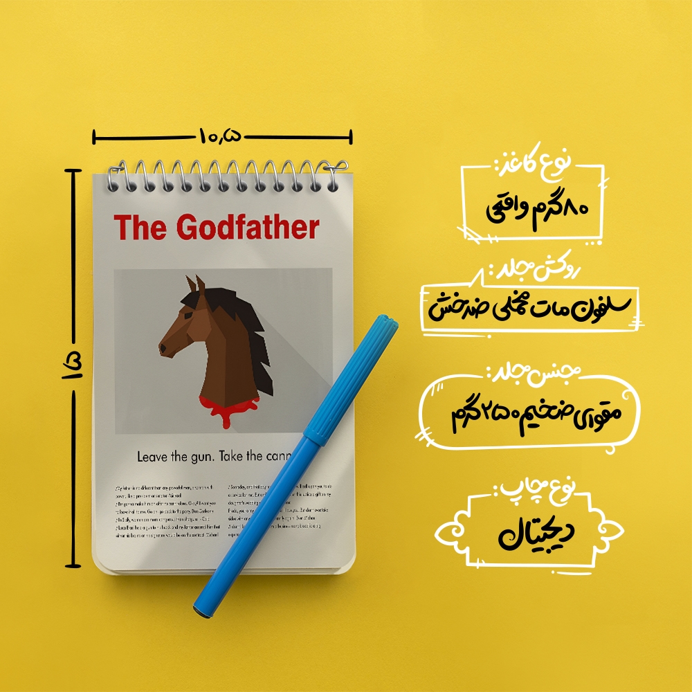 برند خندالو در زمینه تولید انواع دفاتر فانتزی و تحصیلی فعالیت میکند که به دلیل جذابیت ظاهری و طرح های متنوع طرفداران زیادی دارد. دفتر یادداشت خندالو طرح پدرخوانده (The Godfather) محصولی مناسب برای همه عاشقان لوازم التحریر است و همچنین همه کسانی که بنا به موقعیت تحصیل یا شغلشان با دفتر و نوشت افزار زیاد سر و کار دارند. در تولید دفتر یادداشت خندالو طرح پدرخوانده (The Godfather) از نوع صحافی فنر مارپیچ استفاده شده که در این نوع صحافی برگهها به راحتی چرخیده و یا بیرون آورده می شوند. دفتر های خندالو دارای جلد انعطاف پذیر از جنس مقوای گلاسه 250 گرم با روکش سلفون مات مخملی است که به شما امکان میدهد از دفتر خود بدون اینکه نگرانی از شکستن یا خراب شدن جلد را داشته باشید استفاده کنید و همچنین در این دفاتر از کاغذ 80 گرم با کیفیت استفاده شده که باعث میشود هنگام نوشتن به خوبی جوهر قلم بر روی صفحه نشسته و از خط خوردگیها جلوگیری کند. دفتر یادداشت خندالو با جنس و دوام مناسب، برگه های کاملاً سفید و خطوط طوسی دقیق را داراست که انسان را به نوشتن منظم و زیبا ترغیب میکند. طراحی کاملاً مناسب این دفاتر، به همراه کیفیت بالا، از آن یک محصول مورد علاقه و قابل اعتماد برای همه مقاطع تحصیلی میسازد. دفتر یادداشت خندالو طرح پدرخوانده (The Godfather) انتخابی هوشمندانه و مناسب برای افرادی است که به دنبال دفتری با کیفیت و کاربرد عالی هستند. این دفتر، همراه خوبی برای شما در تمام مراحل تحصیل و کار خواهد بود و تجربهای لذتبخش از نوشتن و آموختن را به شما هدیه میدهد.