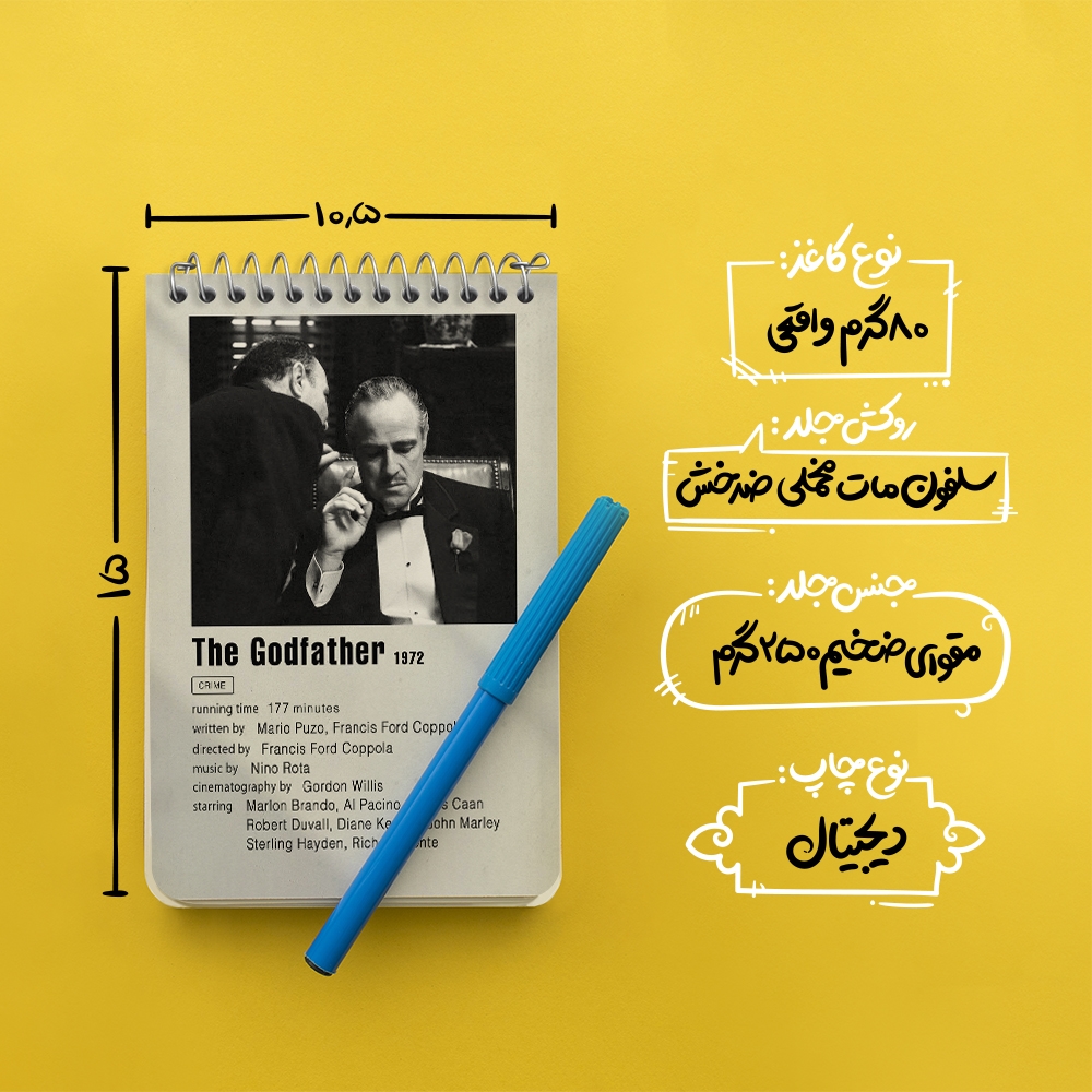 برند خندالو در زمینه تولید انواع دفاتر فانتزی و تحصیلی فعالیت میکند که به دلیل جذابیت ظاهری و طرح های متنوع طرفداران زیادی دارد. دفتر یادداشت خندالو طرح پدر خوانده (The God Father) محصولی مناسب برای همه عاشقان لوازم التحریر است و همچنین همه کسانی که بنا به موقعیت تحصیل یا شغلشان با دفتر و نوشت افزار زیاد سر و کار دارند. در تولید دفتر یادداشت خندالو طرح پدر خوانده (The God Father) از نوع صحافی فنر مارپیچ استفاده شده که در این نوع صحافی برگه‌ها به راحتی چرخیده و یا بیرون آورده می شوند.