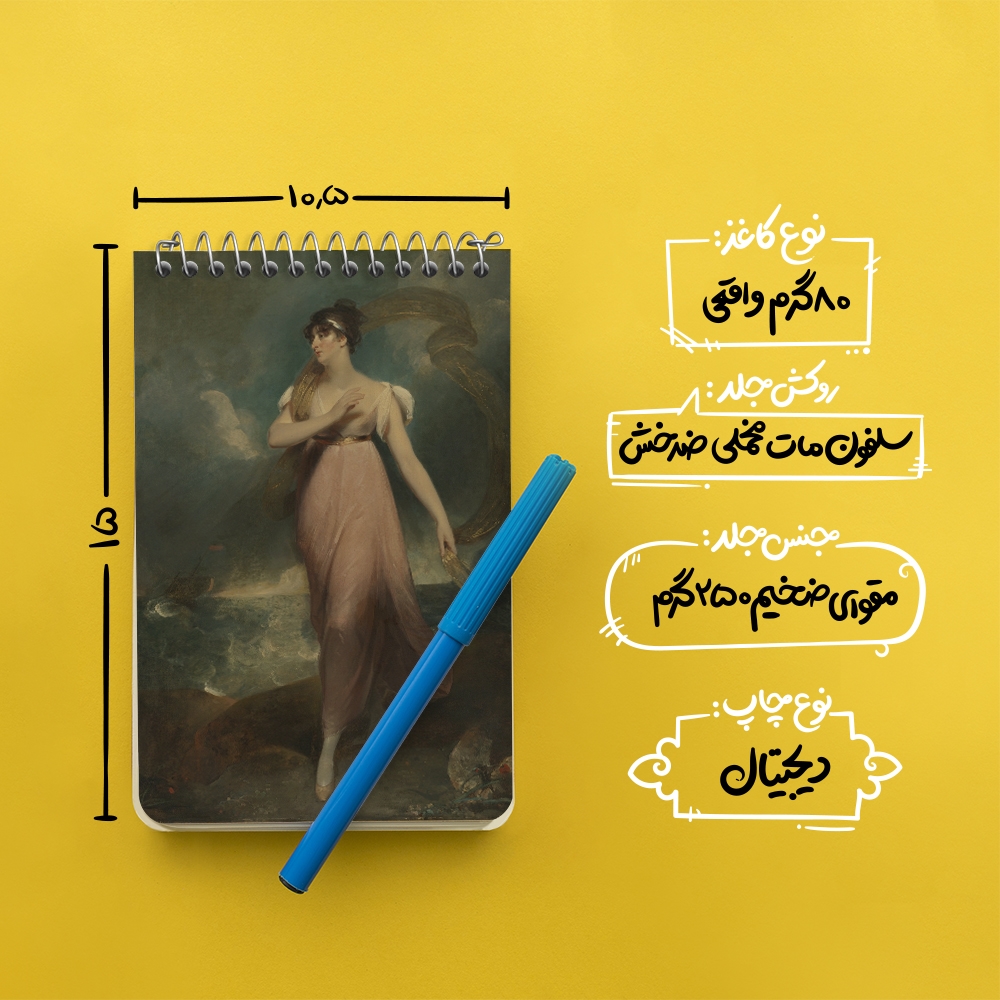 برند خندالو در زمینه تولید انواع دفاتر فانتزی و تحصیلی فعالیت میکند که به دلیل جذابیت ظاهری و طرح های متنوع طرفداران زیادی دارد. دفتر یادداشت خندالو طرح پرتره زنی به عنوان میراندا اثر سر توماس لارنس محصولی مناسب برای همه عاشقان لوازم التحریر است و همچنین همه کسانی که بنا به موقعیت تحصیل یا شغلشان با دفتر و نوشت افزار زیاد سر و کار دارند. در تولید دفتر یادداشت خندالو طرح پرتره زنی به عنوان میراندا اثر سر توماس لارنس از نوع صحافی فنر مارپیچ استفاده شده که در این نوع صحافی برگهها به راحتی چرخیده و یا بیرون آورده می شوند. دفتر های خندالو دارای جلد انعطاف پذیر از جنس مقوای گلاسه 250 گرم با روکش سلفون مات مخملی است که به شما امکان میدهد از دفتر خود بدون اینکه نگرانی از شکستن یا خراب شدن جلد را داشته باشید استفاده کنید و همچنین در این دفاتر از کاغذ 80 گرم با کیفیت استفاده شده که باعث میشود هنگام نوشتن به خوبی جوهر قلم بر روی صفحه نشسته و از خط خوردگیها جلوگیری کند. دفتر یادداشت خندالو با جنس و دوام مناسب، برگه های کاملاً سفید و خطوط طوسی دقیق را داراست که انسان را به نوشتن منظم و زیبا ترغیب میکند. طراحی کاملاً مناسب این دفاتر، به همراه کیفیت بالا، از آن یک محصول مورد علاقه و قابل اعتماد برای همه مقاطع تحصیلی میسازد. دفتر یادداشت خندالو طرح پرتره زنی به عنوان میراندا اثر سر توماس لارنس انتخابی هوشمندانه و مناسب برای افرادی است که به دنبال دفتری با کیفیت و کاربرد عالی هستند. این دفتر، همراه خوبی برای شما در تمام مراحل تحصیل و کار خواهد بود و تجربهای لذتبخش از نوشتن و آموختن را به شما هدیه میدهد.