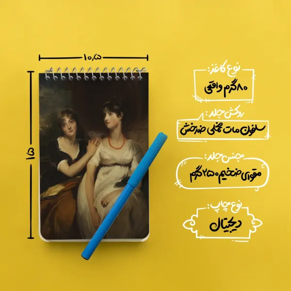 برند خندالو در زمینه تولید انواع دفاتر فانتزی و تحصیلی فعالیت میکند که به دلیل جذابیت ظاهری و طرح های متنوع طرفداران زیادی دارد. دفتر یادداشت خندالو طرح پرتره شارلوت و سارا کارترت هاردی اثر سر توماس لارنس محصولی مناسب برای همه عاشقان لوازم التحریر است و همچنین همه کسانی که بنا به موقعیت تحصیل یا شغلشان با دفتر و نوشت افزار زیاد سر و کار دارند. در تولید دفتر یادداشت خندالو طرح پرتره شارلوت و سارا کارترت هاردی اثر سر توماس لارنس از نوع صحافی فنر مارپیچ استفاده شده که در این نوع صحافی برگهها به راحتی چرخیده و یا بیرون آورده می شوند. دفتر های خندالو دارای جلد انعطاف پذیر از جنس مقوای گلاسه 250 گرم با روکش سلفون مات مخملی است که به شما امکان میدهد از دفتر خود بدون اینکه نگرانی از شکستن یا خراب شدن جلد را داشته باشید استفاده کنید و همچنین در این دفاتر از کاغذ 80 گرم با کیفیت استفاده شده که باعث میشود هنگام نوشتن به خوبی جوهر قلم بر روی صفحه نشسته و از خط خوردگیها جلوگیری کند. دفتر یادداشت خندالو با جنس و دوام مناسب، برگه های کاملاً سفید و خطوط طوسی دقیق را داراست که انسان را به نوشتن منظم و زیبا ترغیب میکند. طراحی کاملاً مناسب این دفاتر، به همراه کیفیت بالا، از آن یک محصول مورد علاقه و قابل اعتماد برای همه مقاطع تحصیلی میسازد. دفتر یادداشت خندالو طرح پرتره شارلوت و سارا کارترت هاردی اثر سر توماس لارنس انتخابی هوشمندانه و مناسب برای افرادی است که به دنبال دفتری با کیفیت و کاربرد عالی هستند. این دفتر، همراه خوبی برای شما در تمام مراحل تحصیل و کار خواهد بود و تجربهای لذتبخش از نوشتن و آموختن را به شما هدیه میدهد.