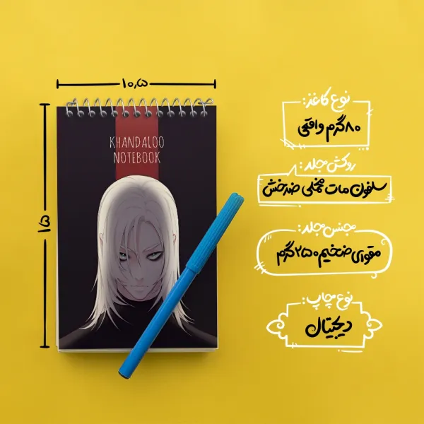 برند خندالو در زمینه تولید انواع دفاتر فانتزی و تحصیلی فعالیت میکند که به دلیل جذابیت ظاهری و طرح های متنوع طرفداران زیادی دارد. دفتر یادداشت خندالو طرح پسر انیمه ای محصولی مناسب برای همه عاشقان لوازم التحریر است و همچنین همه کسانی که بنا به موقعیت تحصیل یا شغلشان با دفتر و نوشت افزار زیاد سر و کار دارند. در تولید دفتر یادداشت خندالو طرح پسر انیمه ای از نوع صحافی فنر مارپیچ استفاده شده که در این نوع صحافی برگه‌ها به راحتی چرخیده و یا بیرون آورده می شوند.