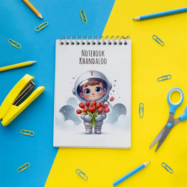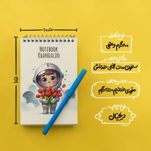برند خندالو در زمینه تولید انواع دفاتر فانتزی و تحصیلی فعالیت میکند که به دلیل جذابیت ظاهری و طرح های متنوع طرفداران زیادی دارد. دفتر یادداشت خندالو طرح پسر فضانورد محصولی مناسب برای همه عاشقان لوازم التحریر است و همچنین همه کسانی که بنا به موقعیت تحصیل یا شغلشان با دفتر و نوشت افزار زیاد سر و کار دارند. در تولید دفتر یادداشت خندالو طرح پسر فضانورد از نوع صحافی فنر مارپیچ استفاده شده که در این نوع صحافی برگه‌ها به راحتی چرخیده و یا بیرون آورده می شوند.
