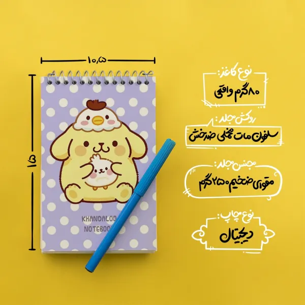 برند خندالو در زمینه تولید انواع دفاتر فانتزی و تحصیلی فعالیت میکند که به دلیل جذابیت ظاهری و طرح های متنوع طرفداران زیادی دارد. دفتر یادداشت خندالو طرح پمپومپورین (Pompompurin) محصولی مناسب برای همه عاشقان لوازم التحریر است و همچنین همه کسانی که بنا به موقعیت تحصیل یا شغلشان با دفتر و نوشت افزار زیاد سر و کار دارند. در تولید دفتر یادداشت خندالو طرح پمپومپورین (Pompompurin) از نوع صحافی فنر مارپیچ استفاده شده که در این نوع صحافی برگهها به راحتی چرخیده و یا بیرون آورده می شوند. دفتر های خندالو دارای جلد انعطاف پذیر از جنس مقوای گلاسه 250 گرم با روکش سلفون مات مخملی است که به شما امکان میدهد از دفتر خود بدون اینکه نگرانی از شکستن یا خراب شدن جلد را داشته باشید استفاده کنید و همچنین در این دفاتر از کاغذ 80 گرم با کیفیت استفاده شده که باعث میشود هنگام نوشتن به خوبی جوهر قلم بر روی صفحه نشسته و از خط خوردگیها جلوگیری کند. دفتر یادداشت خندالو با جنس و دوام مناسب، برگه های کاملاً سفید و خطوط طوسی دقیق را داراست که انسان را به نوشتن منظم و زیبا ترغیب میکند. طراحی کاملاً مناسب این دفاتر، به همراه کیفیت بالا، از آن یک محصول مورد علاقه و قابل اعتماد برای همه مقاطع تحصیلی میسازد. دفتر یادداشت خندالو طرح پمپومپورین (Pompompurin) انتخابی هوشمندانه و مناسب برای افرادی است که به دنبال دفتری با کیفیت و کاربرد عالی هستند. این دفتر، همراه خوبی برای شما در تمام مراحل تحصیل و کار خواهد بود و تجربهای لذتبخش از نوشتن و آموختن را به شما هدیه میدهد.