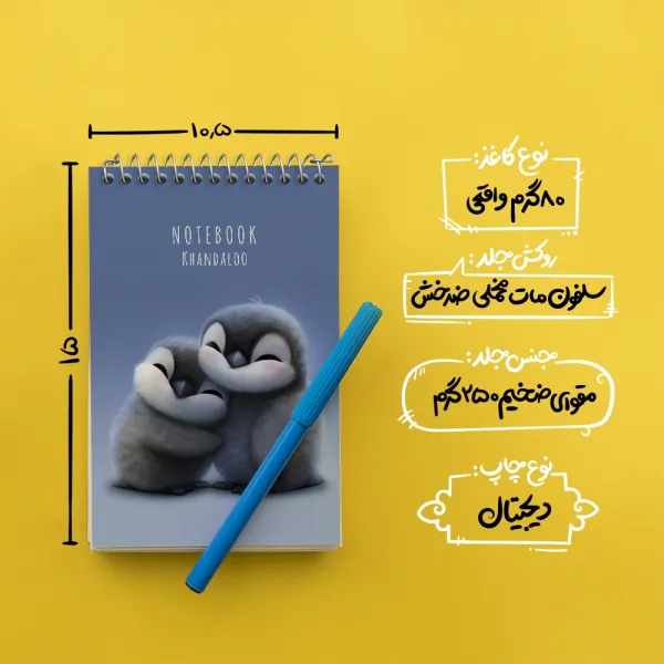 برند خندالو در زمینه تولید انواع دفاتر فانتزی و تحصیلی فعالیت میکند که به دلیل جذابیت ظاهری و طرح های متنوع طرفداران زیادی دارد. دفتر یادداشت خندالو طرح پنگوئن های بامزه محصولی مناسب برای همه عاشقان لوازم التحریر است و همچنین همه کسانی که بنا به موقعیت تحصیل یا شغلشان با دفتر و نوشت افزار زیاد سر و کار دارند. در تولید دفتر یادداشت خندالو طرح پنگوئن های بامزه از نوع صحافی فنر مارپیچ استفاده شده که در این نوع صحافی برگه‌ها به راحتی چرخیده و یا بیرون آورده می شوند.
