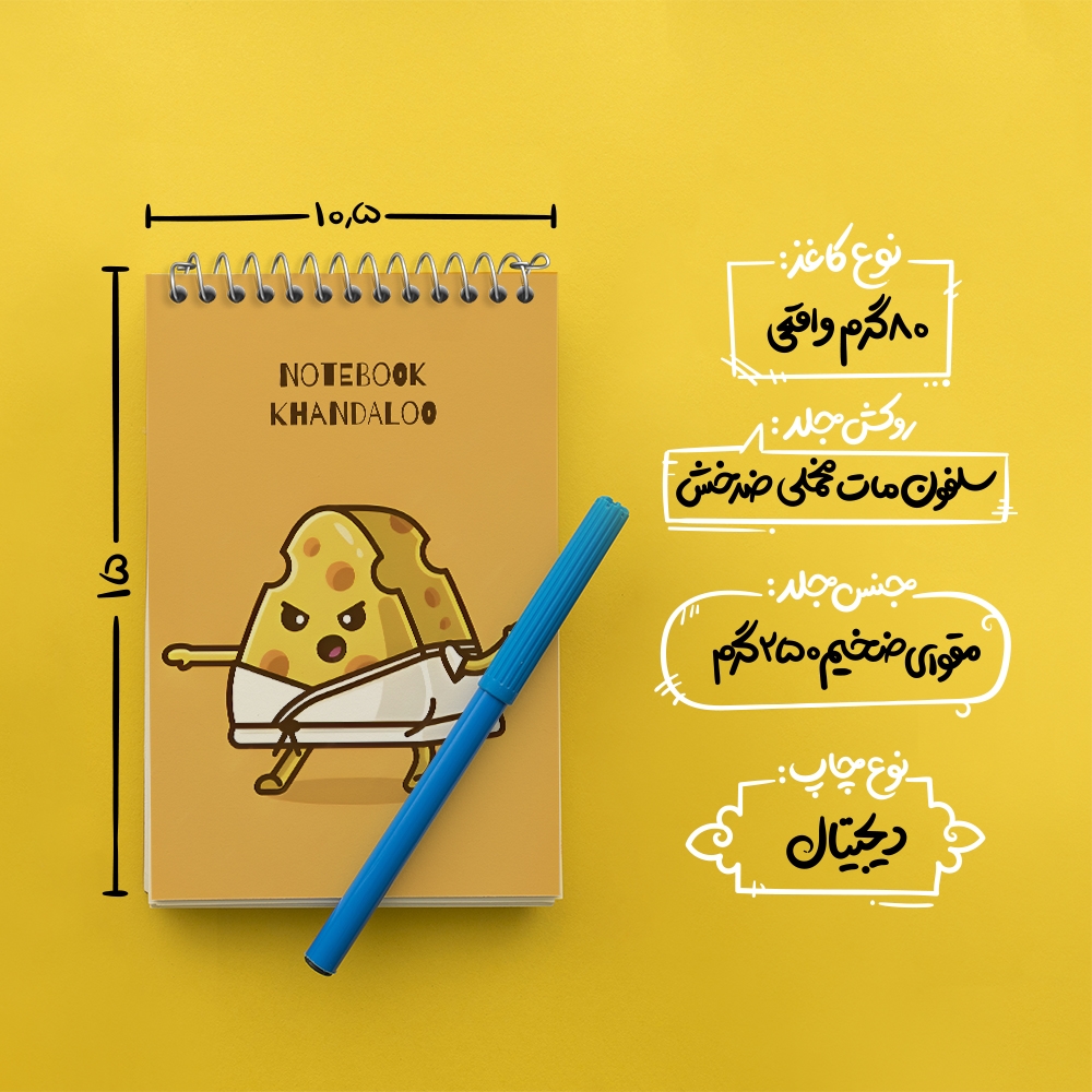 برند خندالو در زمینه تولید انواع دفاتر فانتزی و تحصیلی فعالیت میکند که به دلیل جذابیت ظاهری و طرح های متنوع طرفداران زیادی دارد. دفتر یادداشت خندالو طرح پنیر کاراته کار محصولی مناسب برای همه عاشقان لوازم التحریر است و همچنین همه کسانی که بنا به موقعیت تحصیل یا شغلشان با دفتر و نوشت افزار زیاد سر و کار دارند. در تولید دفتر یادداشت خندالو طرح پنیر کاراته کار از نوع صحافی فنر مارپیچ استفاده شده که در این نوع صحافی برگه‌ها به راحتی چرخیده و یا بیرون آورده می شوند.