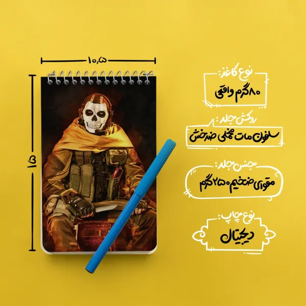 برند خندالو در زمینه تولید انواع دفاتر فانتزی و تحصیلی فعالیت میکند که به دلیل جذابیت ظاهری و طرح های متنوع طرفداران زیادی دارد. دفتر یادداشت خندالو طرح کال آف دیوتی (Call Of Duty) محصولی مناسب برای همه عاشقان لوازم التحریر است و همچنین همه کسانی که بنا به موقعیت تحصیل یا شغلشان با دفتر و نوشت افزار زیاد سر و کار دارند. در تولید دفتر یادداشت خندالو طرح کال آف دیوتی (Call Of Duty) از نوع صحافی فنر مارپیچ استفاده شده که در این نوع صحافی برگهها به راحتی چرخیده و یا بیرون آورده می شوند. دفتر های خندالو دارای جلد انعطاف پذیر از جنس مقوای گلاسه 250 گرم با روکش سلفون مات مخملی است که به شما امکان میدهد از دفتر خود بدون اینکه نگرانی از شکستن یا خراب شدن جلد را داشته باشید استفاده کنید و همچنین در این دفاتر از کاغذ 80 گرم با کیفیت استفاده شده که باعث میشود هنگام نوشتن به خوبی جوهر قلم بر روی صفحه نشسته و از خط خوردگیها جلوگیری کند. دفتر یادداشت خندالو با جنس و دوام مناسب، برگه های کاملاً سفید و خطوط طوسی دقیق را داراست که انسان را به نوشتن منظم و زیبا ترغیب میکند. طراحی کاملاً مناسب این دفاتر، به همراه کیفیت بالا، از آن یک محصول مورد علاقه و قابل اعتماد برای همه مقاطع تحصیلی میسازد. دفتر یادداشت خندالو طرح کال آف دیوتی (Call Of Duty) انتخابی هوشمندانه و مناسب برای افرادی است که به دنبال دفتری با کیفیت و کاربرد عالی هستند. این دفتر، همراه خوبی برای شما در تمام مراحل تحصیل و کار خواهد بود و تجربهای لذتبخش از نوشتن و آموختن را به شما هدیه میدهد.