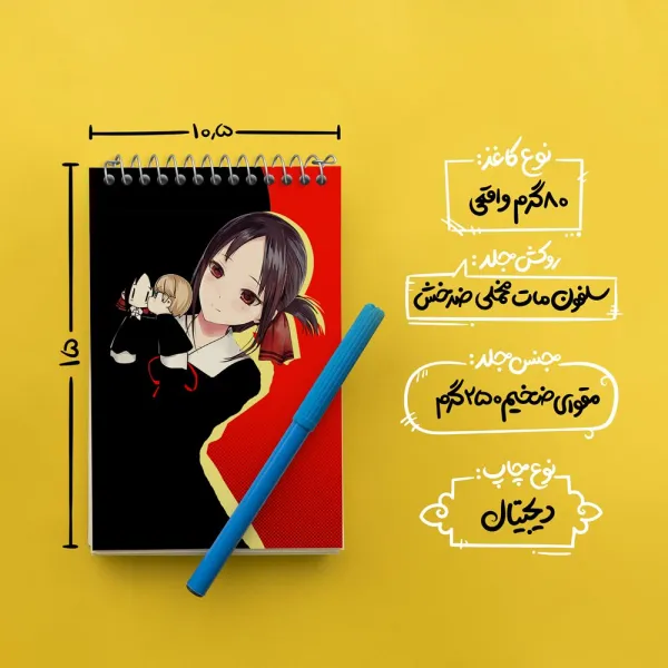 برند خندالو در زمینه تولید انواع دفاتر فانتزی و تحصیلی فعالیت میکند که به دلیل جذابیت ظاهری و طرح های متنوع طرفداران زیادی دارد. دفتر یادداشت خندالو طرح کاگویا ساما انیمه کاگویا ساما محصولی مناسب برای همه عاشقان لوازم التحریر است و همچنین همه کسانی که بنا به موقعیت تحصیل یا شغلشان با دفتر و نوشت افزار زیاد سر و کار دارند. در تولید دفتر یادداشت خندالو طرح کاگویا ساما انیمه کاگویا ساما از نوع صحافی فنر مارپیچ استفاده شده که در این نوع صحافی برگهها به راحتی چرخیده و یا بیرون آورده می شوند. دفتر های خندالو دارای جلد انعطاف پذیر از جنس مقوای گلاسه 250 گرم با روکش سلفون مات مخملی است که به شما امکان میدهد از دفتر خود بدون اینکه نگرانی از شکستن یا خراب شدن جلد را داشته باشید استفاده کنید و همچنین در این دفاتر از کاغذ 80 گرم با کیفیت استفاده شده که باعث میشود هنگام نوشتن به خوبی جوهر قلم بر روی صفحه نشسته و از خط خوردگیها جلوگیری کند. دفتر یادداشت خندالو با جنس و دوام مناسب، برگه های کاملاً سفید و خطوط طوسی دقیق را داراست که انسان را به نوشتن منظم و زیبا ترغیب میکند. طراحی کاملاً مناسب این دفاتر، به همراه کیفیت بالا، از آن یک محصول مورد علاقه و قابل اعتماد برای همه مقاطع تحصیلی میسازد. دفتر یادداشت خندالو طرح کاگویا ساما انیمه کاگویا ساما انتخابی هوشمندانه و مناسب برای افرادی است که به دنبال دفتری با کیفیت و کاربرد عالی هستند. این دفتر، همراه خوبی برای شما در تمام مراحل تحصیل و کار خواهد بود و تجربهای لذتبخش از نوشتن و آموختن را به شما هدیه میدهد.