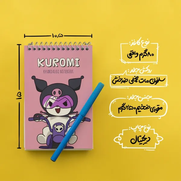 برند خندالو در زمینه تولید انواع دفاتر فانتزی و تحصیلی فعالیت میکند که به دلیل جذابیت ظاهری و طرح های متنوع طرفداران زیادی دارد. دفتر یادداشت خندالو طرح کرومی (Kuromi) محصولی مناسب برای همه عاشقان لوازم التحریر است و همچنین همه کسانی که بنا به موقعیت تحصیل یا شغلشان با دفتر و نوشت افزار زیاد سر و کار دارند. در تولید دفتر یادداشت خندالو طرح کرومی (Kuromi) از نوع صحافی فنر مارپیچ استفاده شده که در این نوع صحافی برگه‌ها به راحتی چرخیده و یا بیرون آورده می شوند.