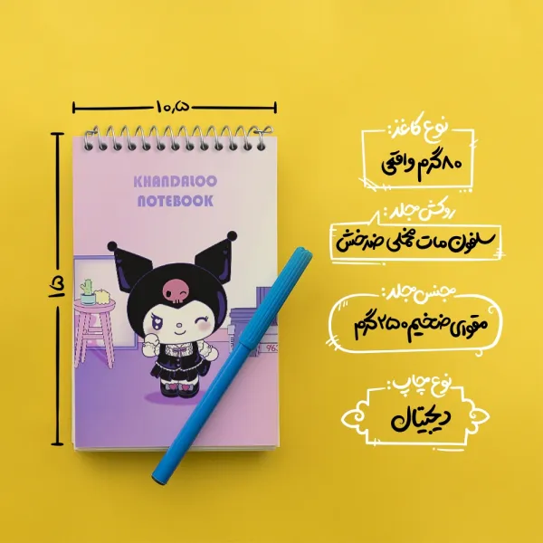 برند خندالو در زمینه تولید انواع دفاتر فانتزی و تحصیلی فعالیت میکند که به دلیل جذابیت ظاهری و طرح های متنوع طرفداران زیادی دارد. دفتر یادداشت خندالو طرح کرومی (Kuromi) محصولی مناسب برای همه عاشقان لوازم التحریر است و همچنین همه کسانی که بنا به موقعیت تحصیل یا شغلشان با دفتر و نوشت افزار زیاد سر و کار دارند. در تولید دفتر یادداشت خندالو طرح کرومی (Kuromi) از نوع صحافی فنر مارپیچ استفاده شده که در این نوع صحافی برگه‌ها به راحتی چرخیده و یا بیرون آورده می شوند.