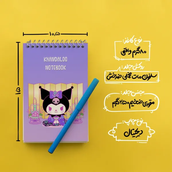 برند خندالو در زمینه تولید انواع دفاتر فانتزی و تحصیلی فعالیت میکند که به دلیل جذابیت ظاهری و طرح های متنوع طرفداران زیادی دارد. دفتر یادداشت خندالو طرح کرومی (Kuromi) محصولی مناسب برای همه عاشقان لوازم التحریر است و همچنین همه کسانی که بنا به موقعیت تحصیل یا شغلشان با دفتر و نوشت افزار زیاد سر و کار دارند. در تولید دفتر یادداشت خندالو طرح کرومی (Kuromi) از نوع صحافی فنر مارپیچ استفاده شده که در این نوع صحافی برگه‌ها به راحتی چرخیده و یا بیرون آورده می شوند.
