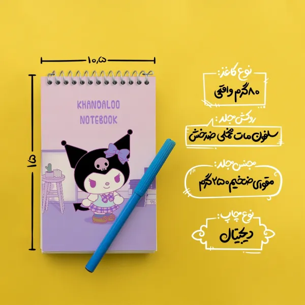 برند خندالو در زمینه تولید انواع دفاتر فانتزی و تحصیلی فعالیت میکند که به دلیل جذابیت ظاهری و طرح های متنوع طرفداران زیادی دارد. دفتر یادداشت خندالو طرح کرومی (Kuromi) محصولی مناسب برای همه عاشقان لوازم التحریر است و همچنین همه کسانی که بنا به موقعیت تحصیل یا شغلشان با دفتر و نوشت افزار زیاد سر و کار دارند. در تولید دفتر یادداشت خندالو طرح کرومی (Kuromi) از نوع صحافی فنر مارپیچ استفاده شده که در این نوع صحافی برگه‌ها به راحتی چرخیده و یا بیرون آورده می شوند.