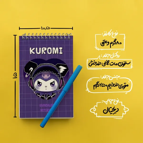 برند خندالو در زمینه تولید انواع دفاتر فانتزی و تحصیلی فعالیت میکند که به دلیل جذابیت ظاهری و طرح های متنوع طرفداران زیادی دارد. دفتر یادداشت خندالو طرح کرومی (Kuromi) محصولی مناسب برای همه عاشقان لوازم التحریر است و همچنین همه کسانی که بنا به موقعیت تحصیل یا شغلشان با دفتر و نوشت افزار زیاد سر و کار دارند. در تولید دفتر یادداشت خندالو طرح کرومی (Kuromi) از نوع صحافی فنر مارپیچ استفاده شده که در این نوع صحافی برگه‌ها به راحتی چرخیده و یا بیرون آورده می شوند.