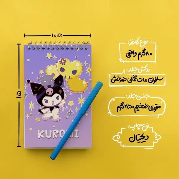 برند خندالو در زمینه تولید انواع دفاتر فانتزی و تحصیلی فعالیت میکند که به دلیل جذابیت ظاهری و طرح های متنوع طرفداران زیادی دارد. دفتر یادداشت خندالو طرح کرومی (Kuromi) محصولی مناسب برای همه عاشقان لوازم التحریر است و همچنین همه کسانی که بنا به موقعیت تحصیل یا شغلشان با دفتر و نوشت افزار زیاد سر و کار دارند. در تولید دفتر یادداشت خندالو طرح کرومی (Kuromi) از نوع صحافی فنر مارپیچ استفاده شده که در این نوع صحافی برگه‌ها به راحتی چرخیده و یا بیرون آورده می شوند.
