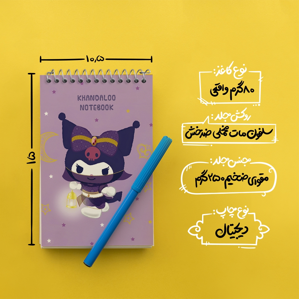 برند خندالو در زمینه تولید انواع دفاتر فانتزی و تحصیلی فعالیت میکند که به دلیل جذابیت ظاهری و طرح های متنوع طرفداران زیادی دارد. دفتر یادداشت خندالو طرح کرومی (Kuromi) محصولی مناسب برای همه عاشقان لوازم التحریر است و همچنین همه کسانی که بنا به موقعیت تحصیل یا شغلشان با دفتر و نوشت افزار زیاد سر و کار دارند. در تولید دفتر یادداشت خندالو طرح کرومی (Kuromi) از نوع صحافی فنر مارپیچ استفاده شده که در این نوع صحافی برگه‌ها به راحتی چرخیده و یا بیرون آورده می شوند.