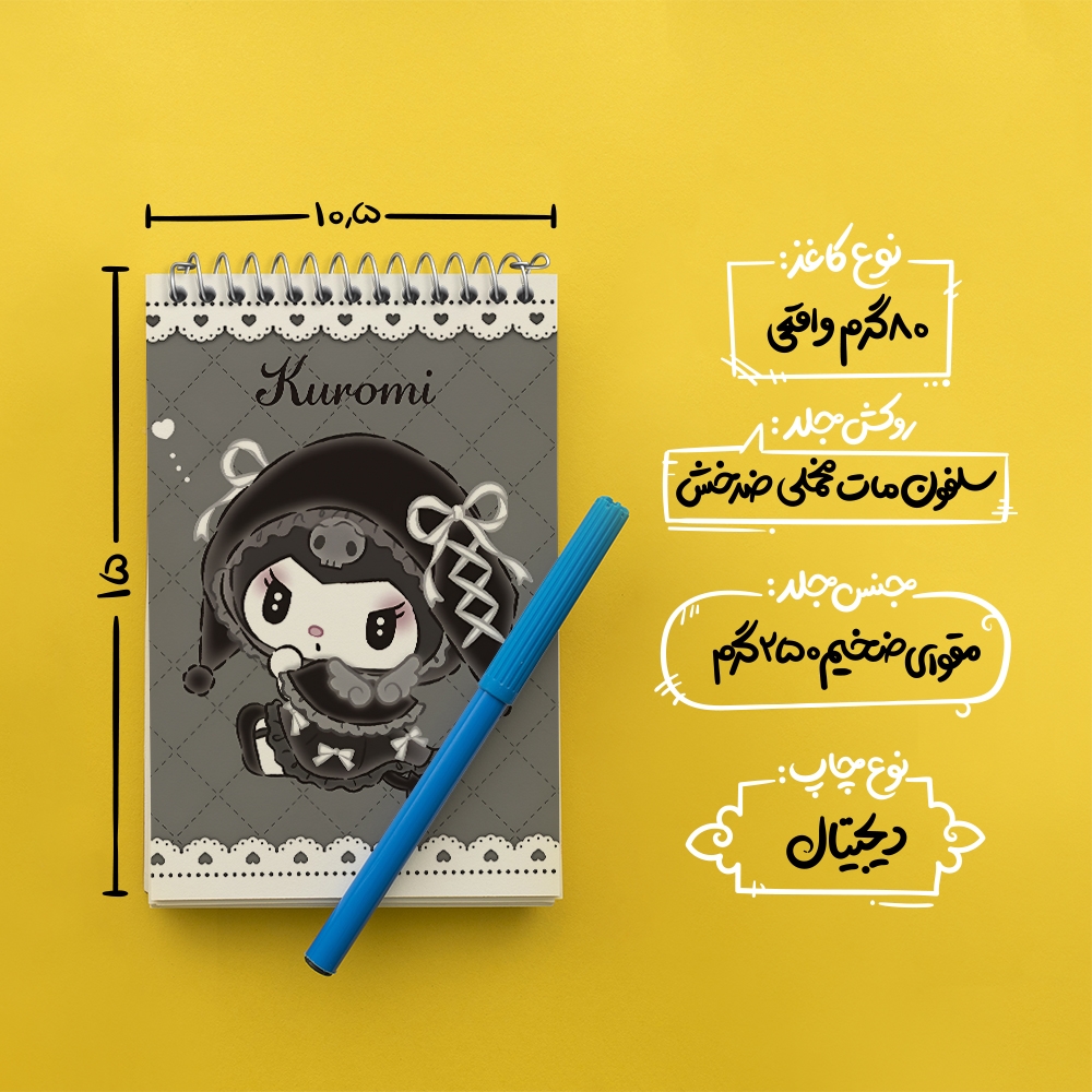 برند خندالو در زمینه تولید انواع دفاتر فانتزی و تحصیلی فعالیت میکند که به دلیل جذابیت ظاهری و طرح های متنوع طرفداران زیادی دارد. دفتر یادداشت خندالو طرح کرومی (Kuromi) محصولی مناسب برای همه عاشقان لوازم التحریر است و همچنین همه کسانی که بنا به موقعیت تحصیل یا شغلشان با دفتر و نوشت افزار زیاد سر و کار دارند. در تولید دفتر یادداشت خندالو طرح کرومی (Kuromi) از نوع صحافی فنر مارپیچ استفاده شده که در این نوع صحافی برگه‌ها به راحتی چرخیده و یا بیرون آورده می شوند.