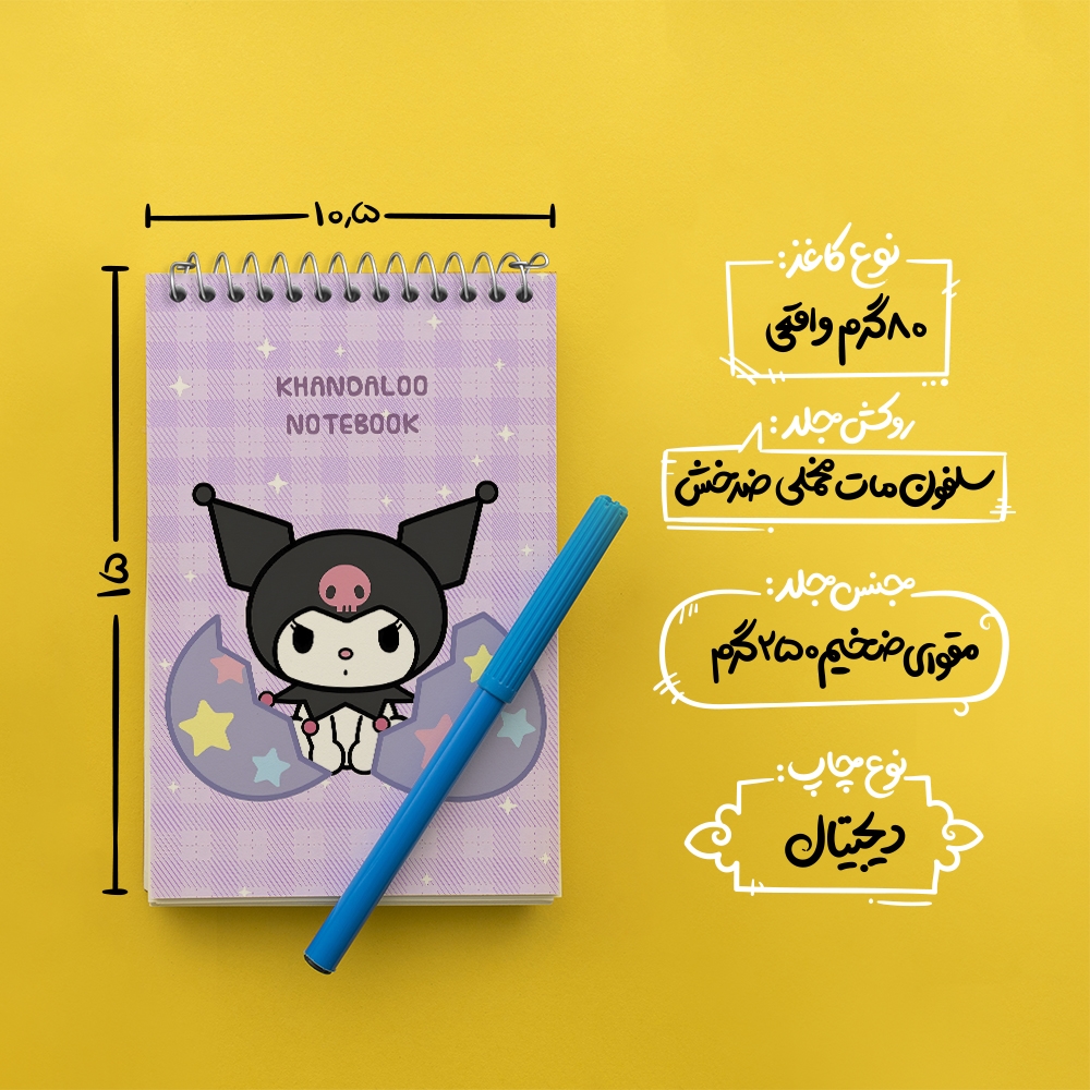 برند خندالو در زمینه تولید انواع دفاتر فانتزی و تحصیلی فعالیت میکند که به دلیل جذابیت ظاهری و طرح های متنوع طرفداران زیادی دارد. دفتر یادداشت خندالو طرح کرومی (Kuromi) محصولی مناسب برای همه عاشقان لوازم التحریر است و همچنین همه کسانی که بنا به موقعیت تحصیل یا شغلشان با دفتر و نوشت افزار زیاد سر و کار دارند. در تولید دفتر یادداشت خندالو طرح کرومی (Kuromi) از نوع صحافی فنر مارپیچ استفاده شده که در این نوع صحافی برگه‌ها به راحتی چرخیده و یا بیرون آورده می شوند.