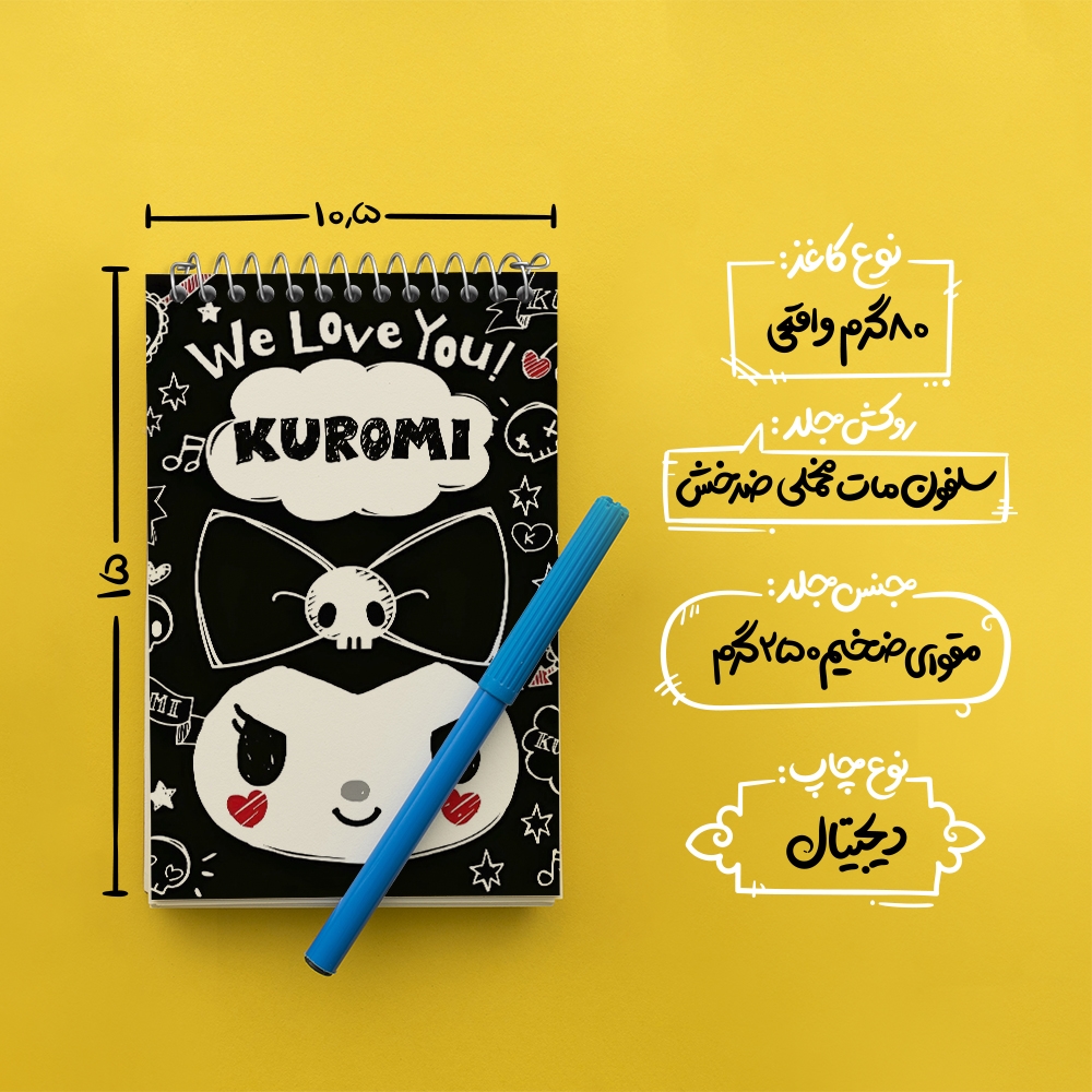 برند خندالو در زمینه تولید انواع دفاتر فانتزی و تحصیلی فعالیت میکند که به دلیل جذابیت ظاهری و طرح های متنوع طرفداران زیادی دارد. دفتر یادداشت خندالو طرح کرومی (Kuromi) محصولی مناسب برای همه عاشقان لوازم التحریر است و همچنین همه کسانی که بنا به موقعیت تحصیل یا شغلشان با دفتر و نوشت افزار زیاد سر و کار دارند. در تولید دفتر یادداشت خندالو طرح کرومی (Kuromi) از نوع صحافی فنر مارپیچ استفاده شده که در این نوع صحافی برگه‌ها به راحتی چرخیده و یا بیرون آورده می شوند.