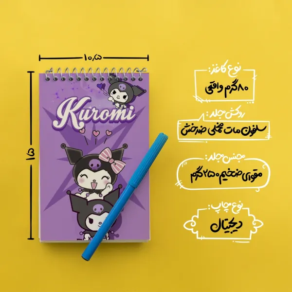 برند خندالو در زمینه تولید انواع دفاتر فانتزی و تحصیلی فعالیت میکند که به دلیل جذابیت ظاهری و طرح های متنوع طرفداران زیادی دارد. دفتر یادداشت خندالو طرح کرومی (Kuromi) محصولی مناسب برای همه عاشقان لوازم التحریر است و همچنین همه کسانی که بنا به موقعیت تحصیل یا شغلشان با دفتر و نوشت افزار زیاد سر و کار دارند. در تولید دفتر یادداشت خندالو طرح کرومی (Kuromi) از نوع صحافی فنر مارپیچ استفاده شده که در این نوع صحافی برگه‌ها به راحتی چرخیده و یا بیرون آورده می شوند.