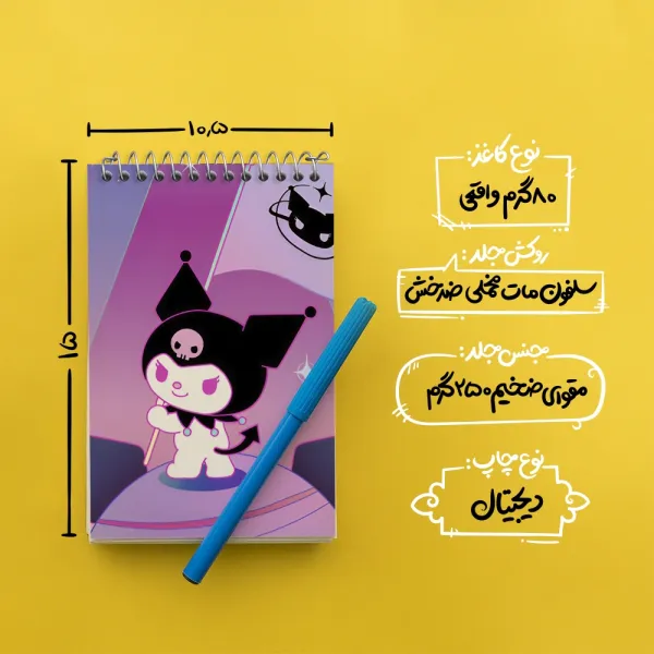 برند خندالو در زمینه تولید انواع دفاتر فانتزی و تحصیلی فعالیت میکند که به دلیل جذابیت ظاهری و طرح های متنوع طرفداران زیادی دارد. دفتر یادداشت خندالو طرح کرومی (Kuromi) محصولی مناسب برای همه عاشقان لوازم التحریر است و همچنین همه کسانی که بنا به موقعیت تحصیل یا شغلشان با دفتر و نوشت افزار زیاد سر و کار دارند. در تولید دفتر یادداشت خندالو طرح کرومی (Kuromi) از نوع صحافی فنر مارپیچ استفاده شده که در این نوع صحافی برگه‌ها به راحتی چرخیده و یا بیرون آورده می شوند.