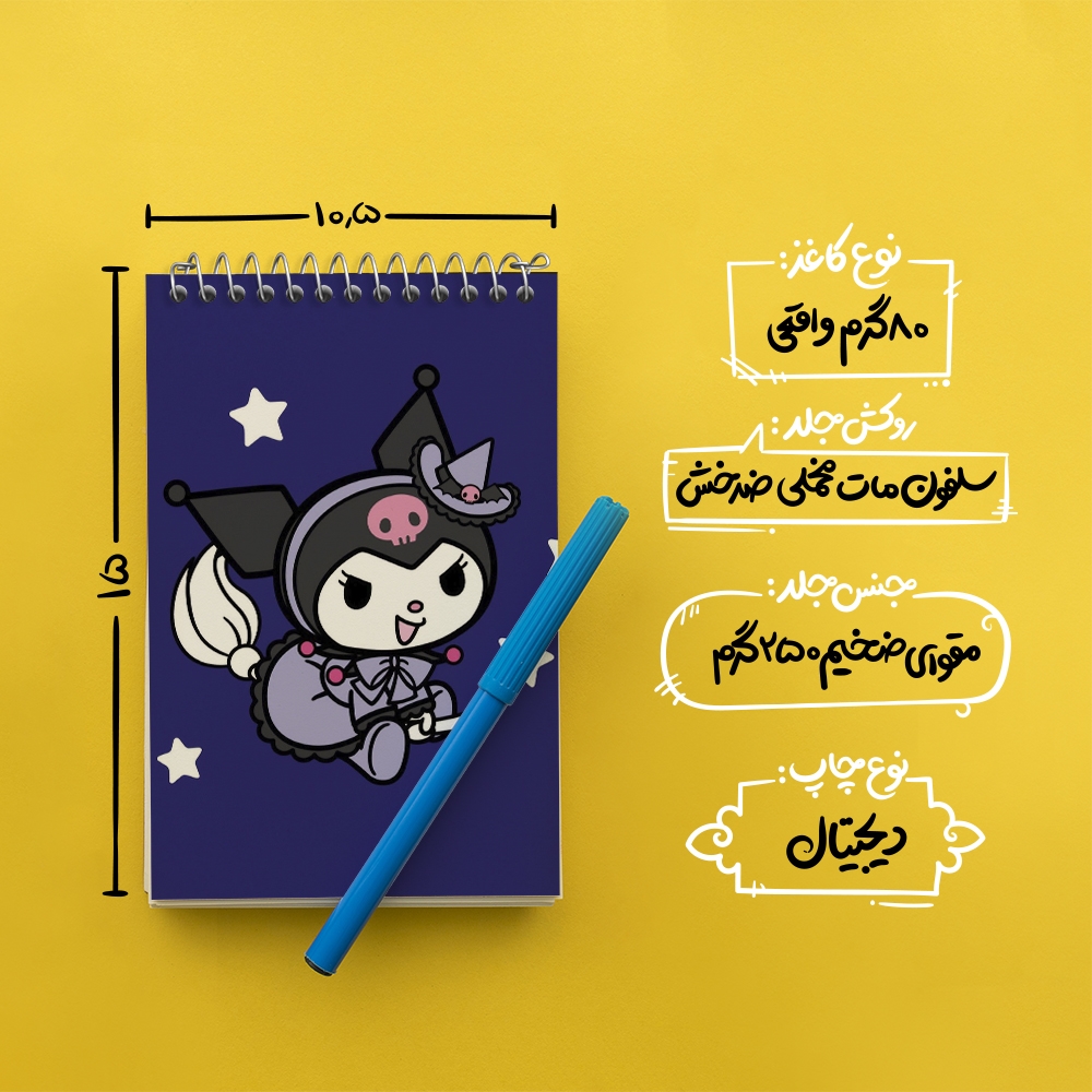 برند خندالو در زمینه تولید انواع دفاتر فانتزی و تحصیلی فعالیت میکند که به دلیل جذابیت ظاهری و طرح های متنوع طرفداران زیادی دارد. دفتر یادداشت خندالو طرح کرومی (Kuromi) محصولی مناسب برای همه عاشقان لوازم التحریر است و همچنین همه کسانی که بنا به موقعیت تحصیل یا شغلشان با دفتر و نوشت افزار زیاد سر و کار دارند. در تولید دفتر یادداشت خندالو طرح کرومی (Kuromi) از نوع صحافی فنر مارپیچ استفاده شده که در این نوع صحافی برگه‌ها به راحتی چرخیده و یا بیرون آورده می شوند.