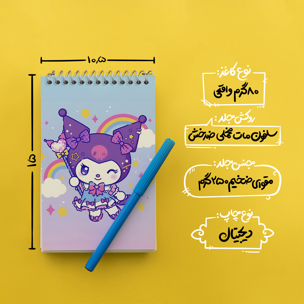 برند خندالو در زمینه تولید انواع دفاتر فانتزی و تحصیلی فعالیت میکند که به دلیل جذابیت ظاهری و طرح های متنوع طرفداران زیادی دارد. دفتر یادداشت خندالو طرح کرومی (Kuromi) محصولی مناسب برای همه عاشقان لوازم التحریر است و همچنین همه کسانی که بنا به موقعیت تحصیل یا شغلشان با دفتر و نوشت افزار زیاد سر و کار دارند. در تولید دفتر یادداشت خندالو طرح کرومی (Kuromi) از نوع صحافی فنر مارپیچ استفاده شده که در این نوع صحافی برگه‌ها به راحتی چرخیده و یا بیرون آورده می شوند.