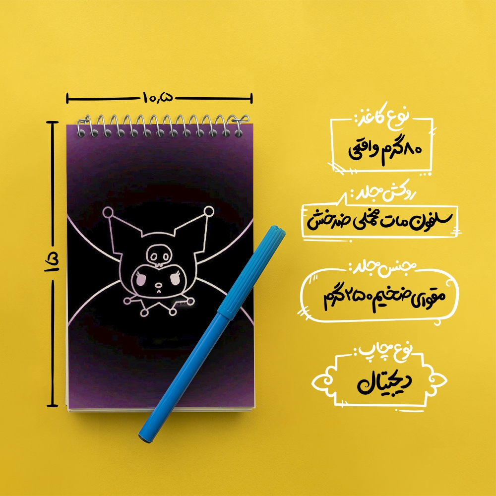 برند خندالو در زمینه تولید انواع دفاتر فانتزی و تحصیلی فعالیت میکند که به دلیل جذابیت ظاهری و طرح های متنوع طرفداران زیادی دارد. دفتر یادداشت خندالو طرح کرومی (Kuromi) محصولی مناسب برای همه عاشقان لوازم التحریر است و همچنین همه کسانی که بنا به موقعیت تحصیل یا شغلشان با دفتر و نوشت افزار زیاد سر و کار دارند. در تولید دفتر یادداشت خندالو طرح کرومی (Kuromi) از نوع صحافی فنر مارپیچ استفاده شده که در این نوع صحافی برگه‌ها به راحتی چرخیده و یا بیرون آورده می شوند.