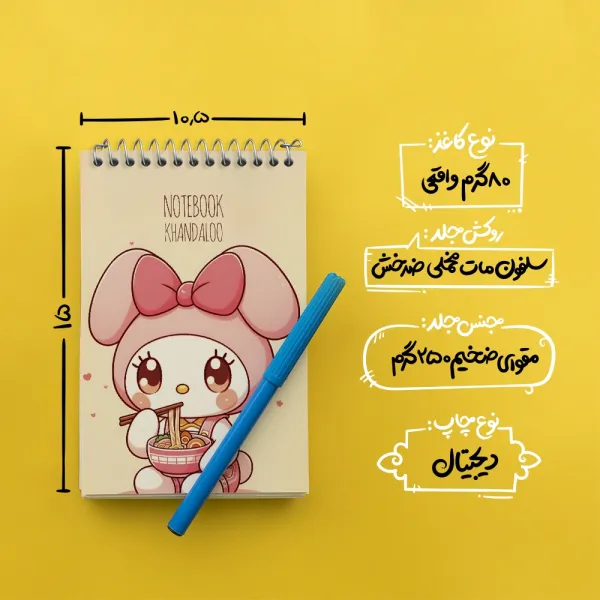 برند خندالو در زمینه تولید انواع دفاتر فانتزی و تحصیلی فعالیت میکند که به دلیل جذابیت ظاهری و طرح های متنوع طرفداران زیادی دارد. دفتر یادداشت خندالو طرح کرومی (Kuromi) محصولی مناسب برای همه عاشقان لوازم التحریر است و همچنین همه کسانی که بنا به موقعیت تحصیل یا شغلشان با دفتر و نوشت افزار زیاد سر و کار دارند. در تولید دفتر یادداشت خندالو طرح کرومی (Kuromi) از نوع صحافی فنر مارپیچ استفاده شده که در این نوع صحافی برگه‌ها به راحتی چرخیده و یا بیرون آورده می شوند.