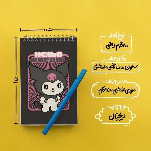 برند خندالو در زمینه تولید انواع دفاتر فانتزی و تحصیلی فعالیت میکند که به دلیل جذابیت ظاهری و طرح های متنوع طرفداران زیادی دارد. دفتر یادداشت خندالو طرح کرومی (Kuromi) محصولی مناسب برای همه عاشقان لوازم التحریر است و همچنین همه کسانی که بنا به موقعیت تحصیل یا شغلشان با دفتر و نوشت افزار زیاد سر و کار دارند. در تولید دفتر یادداشت خندالو طرح کرومی (Kuromi) از نوع صحافی فنر مارپیچ استفاده شده که در این نوع صحافی برگه‌ها به راحتی چرخیده و یا بیرون آورده می شوند.