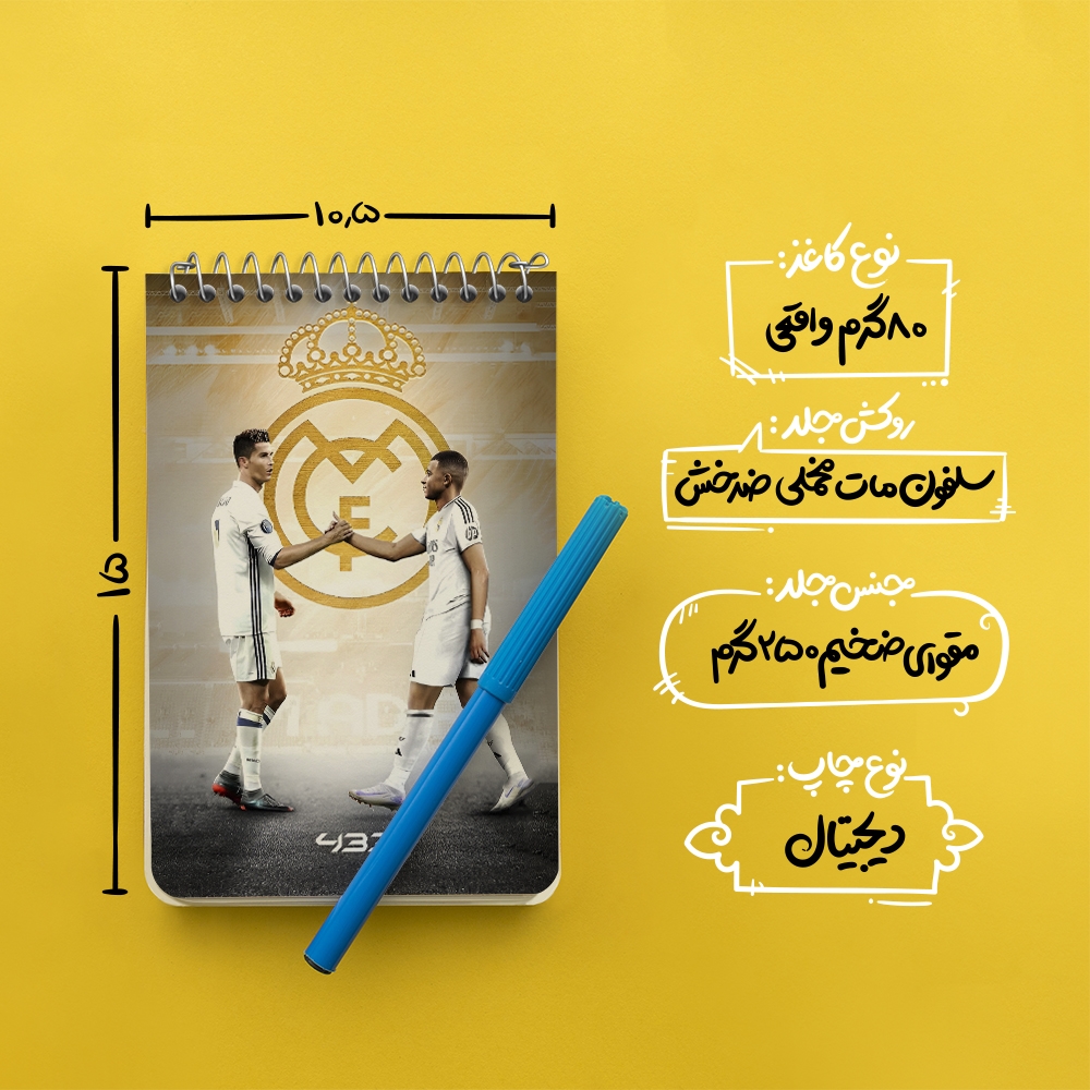 برند خندالو در زمینه تولید انواع دفاتر فانتزی و تحصیلی فعالیت میکند که به دلیل جذابیت ظاهری و طرح های متنوع طرفداران زیادی دارد. دفتر یادداشت خندالو طرح کریستیانو رونالدو و امباپه محصولی مناسب برای همه عاشقان لوازم التحریر است و همچنین همه کسانی که بنا به موقعیت تحصیل یا شغلشان با دفتر و نوشت افزار زیاد سر و کار دارند. در تولید دفتر یادداشت خندالو طرح کریستیانو رونالدو و امباپه از نوع صحافی فنر مارپیچ استفاده شده که در این نوع صحافی برگهها به راحتی چرخیده و یا بیرون آورده می شوند. دفتر های خندالو دارای جلد انعطاف پذیر از جنس مقوای گلاسه 250 گرم با روکش سلفون مات مخملی است که به شما امکان میدهد از دفتر خود بدون اینکه نگرانی از شکستن یا خراب شدن جلد را داشته باشید استفاده کنید و همچنین در این دفاتر از کاغذ 80 گرم با کیفیت استفاده شده که باعث میشود هنگام نوشتن به خوبی جوهر قلم بر روی صفحه نشسته و از خط خوردگیها جلوگیری کند. دفتر یادداشت خندالو با جنس و دوام مناسب، برگه های کاملاً سفید و خطوط طوسی دقیق را داراست که انسان را به نوشتن منظم و زیبا ترغیب میکند. طراحی کاملاً مناسب این دفاتر، به همراه کیفیت بالا، از آن یک محصول مورد علاقه و قابل اعتماد برای همه مقاطع تحصیلی میسازد. دفتر یادداشت خندالو طرح کریستیانو رونالدو و امباپه انتخابی هوشمندانه و مناسب برای افرادی است که به دنبال دفتری با کیفیت و کاربرد عالی هستند. این دفتر، همراه خوبی برای شما در تمام مراحل تحصیل و کار خواهد بود و تجربهای لذتبخش از نوشتن و آموختن را به شما هدیه میدهد.