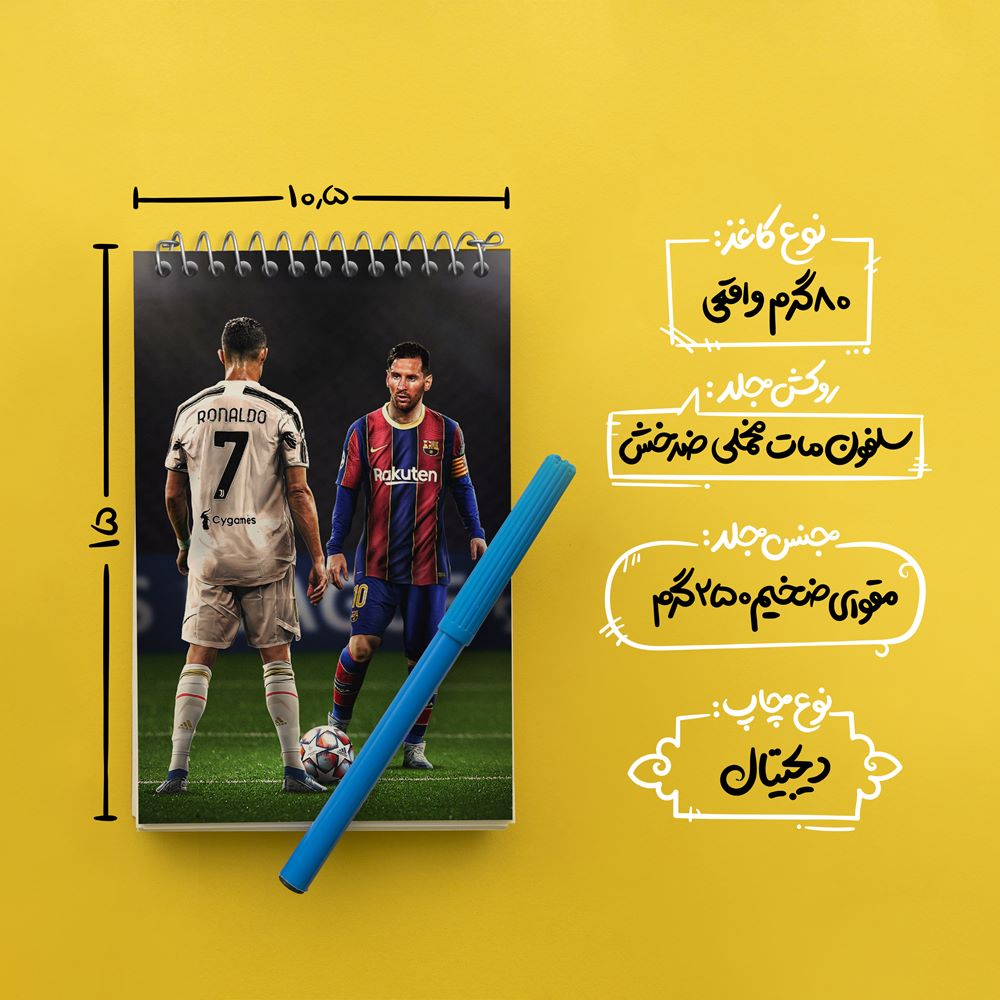 برند خندالو در زمینه تولید انواع دفاتر فانتزی و تحصیلی فعالیت میکند که به دلیل جذابیت ظاهری و طرح های متنوع طرفداران زیادی دارد. دفتر یادداشت خندالو طرح کریستیانو رونالدو و لیونل مسی محصولی مناسب برای همه عاشقان لوازم التحریر است و همچنین همه کسانی که بنا به موقعیت تحصیل یا شغلشان با دفتر و نوشت افزار زیاد سر و کار دارند. در تولید دفتر یادداشت خندالو طرح کریستیانو رونالدو و لیونل مسی از نوع صحافی فنر مارپیچ استفاده شده که در این نوع صحافی برگهها به راحتی چرخیده و یا بیرون آورده می شوند. دفتر های خندالو دارای جلد انعطاف پذیر از جنس مقوای گلاسه 250 گرم با روکش سلفون مات مخملی است که به شما امکان میدهد از دفتر خود بدون اینکه نگرانی از شکستن یا خراب شدن جلد را داشته باشید استفاده کنید و همچنین در این دفاتر از کاغذ 80 گرم با کیفیت استفاده شده که باعث میشود هنگام نوشتن به خوبی جوهر قلم بر روی صفحه نشسته و از خط خوردگیها جلوگیری کند. دفتر یادداشت خندالو با جنس و دوام مناسب، برگه های کاملاً سفید و خطوط طوسی دقیق را داراست که انسان را به نوشتن منظم و زیبا ترغیب میکند. طراحی کاملاً مناسب این دفاتر، به همراه کیفیت بالا، از آن یک محصول مورد علاقه و قابل اعتماد برای همه مقاطع تحصیلی میسازد. دفتر یادداشت خندالو طرح کریستیانو رونالدو و لیونل مسی انتخابی هوشمندانه و مناسب برای افرادی است که به دنبال دفتری با کیفیت و کاربرد عالی هستند. این دفتر، همراه خوبی برای شما در تمام مراحل تحصیل و کار خواهد بود و تجربهای لذتبخش از نوشتن و آموختن را به شما هدیه میدهد.