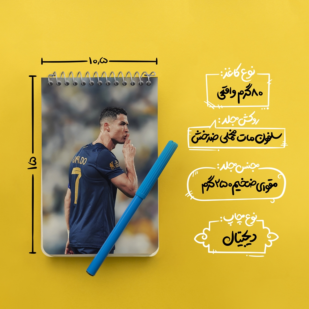 برند خندالو در زمینه تولید انواع دفاتر فانتزی و تحصیلی فعالیت میکند که به دلیل جذابیت ظاهری و طرح های متنوع طرفداران زیادی دارد. دفتر یادداشت خندالو طرح کریستیانو رونالدو محصولی مناسب برای همه عاشقان لوازم التحریر است و همچنین همه کسانی که بنا به موقعیت تحصیل یا شغلشان با دفتر و نوشت افزار زیاد سر و کار دارند. در تولید دفتر یادداشت خندالو طرح کریستیانو رونالدو از نوع صحافی فنر مارپیچ استفاده شده که در این نوع صحافی برگه‌ها به راحتی چرخیده و یا بیرون آورده می شوند.