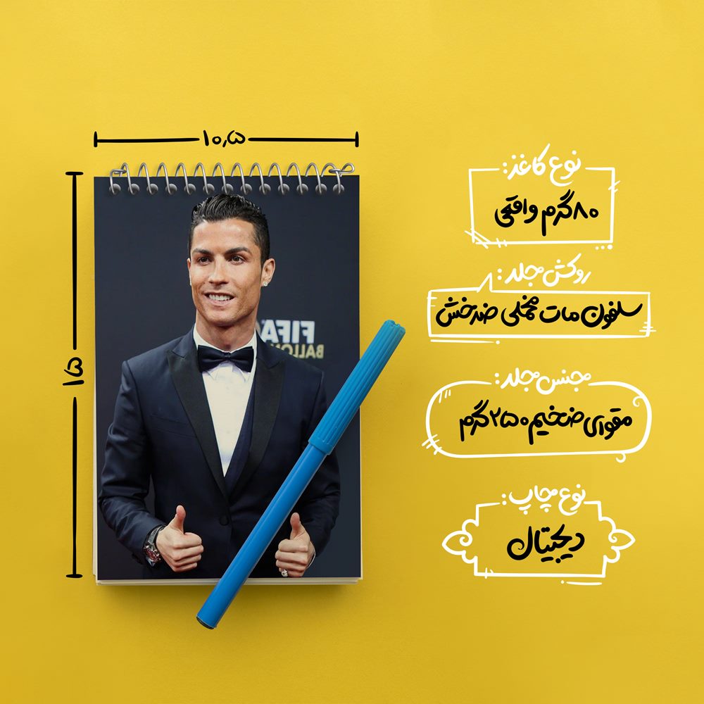 برند خندالو در زمینه تولید انواع دفاتر فانتزی و تحصیلی فعالیت میکند که به دلیل جذابیت ظاهری و طرح های متنوع طرفداران زیادی دارد. دفتر یادداشت خندالو طرح کریستیانو رونالدو محصولی مناسب برای همه عاشقان لوازم التحریر است و همچنین همه کسانی که بنا به موقعیت تحصیل یا شغلشان با دفتر و نوشت افزار زیاد سر و کار دارند. در تولید دفتر یادداشت خندالو طرح کریستیانو رونالدو از نوع صحافی فنر مارپیچ استفاده شده که در این نوع صحافی برگه‌ها به راحتی چرخیده و یا بیرون آورده می شوند.