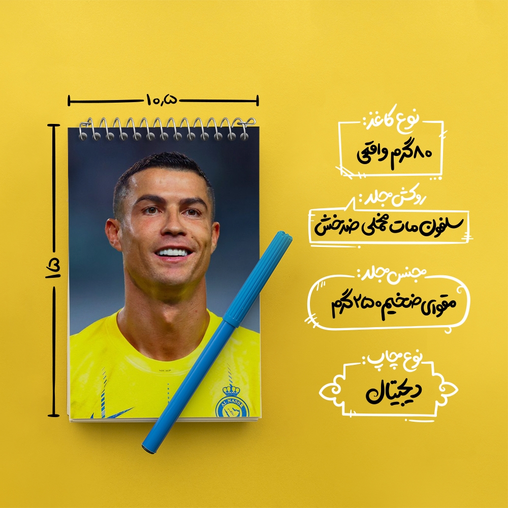 برند خندالو در زمینه تولید انواع دفاتر فانتزی و تحصیلی فعالیت میکند که به دلیل جذابیت ظاهری و طرح های متنوع طرفداران زیادی دارد. دفتر یادداشت خندالو طرح کریستیانو رونالدو محصولی مناسب برای همه عاشقان لوازم التحریر است و همچنین همه کسانی که بنا به موقعیت تحصیل یا شغلشان با دفتر و نوشت افزار زیاد سر و کار دارند. در تولید دفتر یادداشت خندالو طرح کریستیانو رونالدو از نوع صحافی فنر مارپیچ استفاده شده که در این نوع صحافی برگه‌ها به راحتی چرخیده و یا بیرون آورده می شوند.