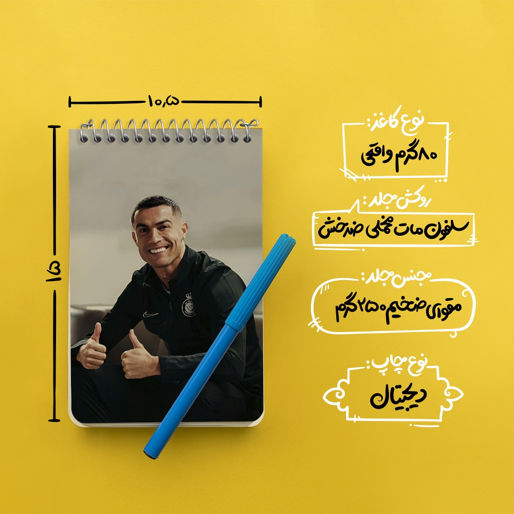 برند خندالو در زمینه تولید انواع دفاتر فانتزی و تحصیلی فعالیت میکند که به دلیل جذابیت ظاهری و طرح های متنوع طرفداران زیادی دارد. دفتر یادداشت خندالو طرح کریستیانو رونالدو محصولی مناسب برای همه عاشقان لوازم التحریر است و همچنین همه کسانی که بنا به موقعیت تحصیل یا شغلشان با دفتر و نوشت افزار زیاد سر و کار دارند. در تولید دفتر یادداشت خندالو طرح کریستیانو رونالدو از نوع صحافی فنر مارپیچ استفاده شده که در این نوع صحافی برگه‌ها به راحتی چرخیده و یا بیرون آورده می شوند.