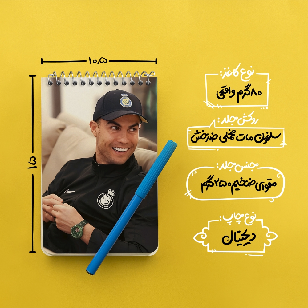 برند خندالو در زمینه تولید انواع دفاتر فانتزی و تحصیلی فعالیت میکند که به دلیل جذابیت ظاهری و طرح های متنوع طرفداران زیادی دارد. دفتر یادداشت خندالو طرح کریستیانو رونالدو محصولی مناسب برای همه عاشقان لوازم التحریر است و همچنین همه کسانی که بنا به موقعیت تحصیل یا شغلشان با دفتر و نوشت افزار زیاد سر و کار دارند. در تولید دفتر یادداشت خندالو طرح کریستیانو رونالدو از نوع صحافی فنر مارپیچ استفاده شده که در این نوع صحافی برگه‌ها به راحتی چرخیده و یا بیرون آورده می شوند.