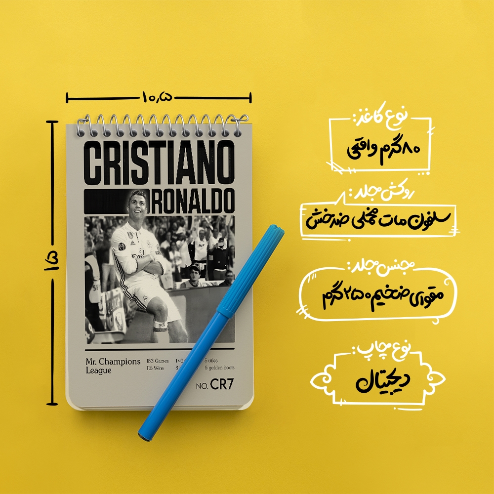 برند خندالو در زمینه تولید انواع دفاتر فانتزی و تحصیلی فعالیت میکند که به دلیل جذابیت ظاهری و طرح های متنوع طرفداران زیادی دارد. دفتر یادداشت خندالو طرح کریستیانو رونالدو محصولی مناسب برای همه عاشقان لوازم التحریر است و همچنین همه کسانی که بنا به موقعیت تحصیل یا شغلشان با دفتر و نوشت افزار زیاد سر و کار دارند. در تولید دفتر یادداشت خندالو طرح کریستیانو رونالدو از نوع صحافی فنر مارپیچ استفاده شده که در این نوع صحافی برگه‌ها به راحتی چرخیده و یا بیرون آورده می شوند.