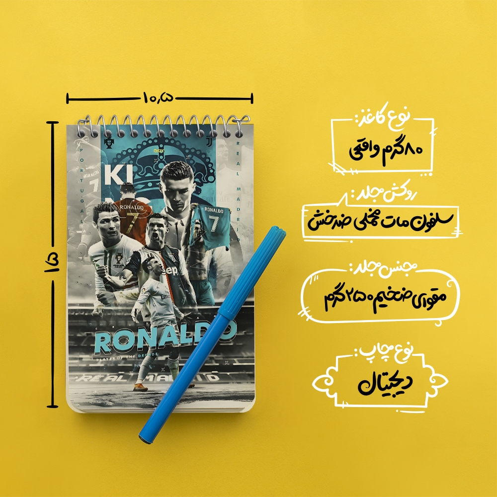 برند خندالو در زمینه تولید انواع دفاتر فانتزی و تحصیلی فعالیت میکند که به دلیل جذابیت ظاهری و طرح های متنوع طرفداران زیادی دارد. دفتر یادداشت خندالو طرح کریستیانو رونالدو محصولی مناسب برای همه عاشقان لوازم التحریر است و همچنین همه کسانی که بنا به موقعیت تحصیل یا شغلشان با دفتر و نوشت افزار زیاد سر و کار دارند. در تولید دفتر یادداشت خندالو طرح کریستیانو رونالدو از نوع صحافی فنر مارپیچ استفاده شده که در این نوع صحافی برگه‌ها به راحتی چرخیده و یا بیرون آورده می شوند.