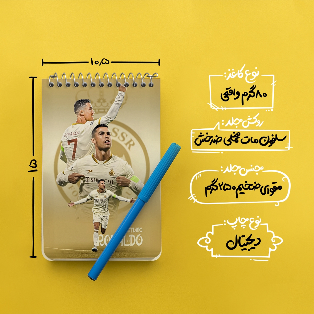 برند خندالو در زمینه تولید انواع دفاتر فانتزی و تحصیلی فعالیت میکند که به دلیل جذابیت ظاهری و طرح های متنوع طرفداران زیادی دارد. دفتر یادداشت خندالو طرح کریستیانو رونالدو محصولی مناسب برای همه عاشقان لوازم التحریر است و همچنین همه کسانی که بنا به موقعیت تحصیل یا شغلشان با دفتر و نوشت افزار زیاد سر و کار دارند. در تولید دفتر یادداشت خندالو طرح کریستیانو رونالدو از نوع صحافی فنر مارپیچ استفاده شده که در این نوع صحافی برگه‌ها به راحتی چرخیده و یا بیرون آورده می شوند.