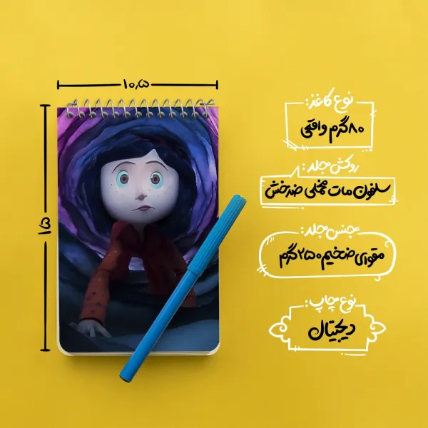 برند خندالو در زمینه تولید انواع دفاتر فانتزی و تحصیلی فعالیت میکند که به دلیل جذابیت ظاهری و طرح های متنوع طرفداران زیادی دارد. دفتر یادداشت خندالو طرح کورالین (Coraline) محصولی مناسب برای همه عاشقان لوازم التحریر است و همچنین همه کسانی که بنا به موقعیت تحصیل یا شغلشان با دفتر و نوشت افزار زیاد سر و کار دارند. در تولید دفتر یادداشت خندالو طرح کورالین (Coraline) از نوع صحافی فنر مارپیچ استفاده شده که در این نوع صحافی برگه‌ها به راحتی چرخیده و یا بیرون آورده می شوند.