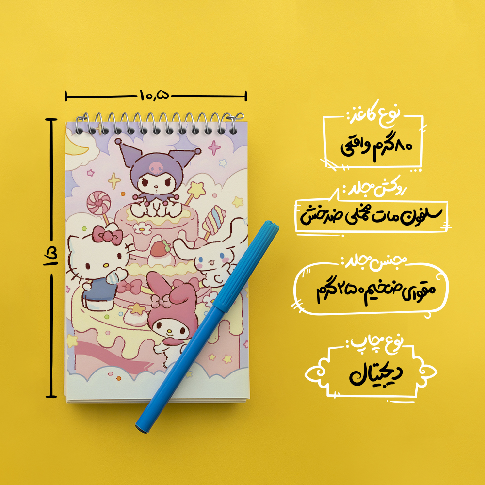 برند خندالو در زمینه تولید انواع دفاتر فانتزی و تحصیلی فعالیت میکند که به دلیل جذابیت ظاهری و طرح های متنوع طرفداران زیادی دارد. دفتر یادداشت خندالو طرح کورومی و کیتی محصولی مناسب برای همه عاشقان لوازم التحریر است و همچنین همه کسانی که بنا به موقعیت تحصیل یا شغلشان با دفتر و نوشت افزار زیاد سر و کار دارند. در تولید دفتر یادداشت خندالو طرح کورومی و کیتی از نوع صحافی فنر مارپیچ استفاده شده که در این نوع صحافی برگه‌ها به راحتی چرخیده و یا بیرون آورده می شوند.