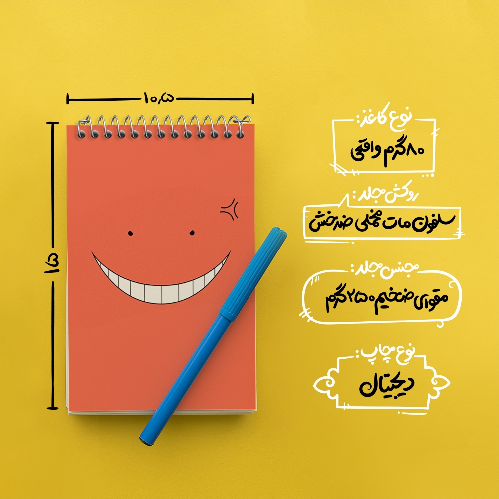 برند خندالو در زمینه تولید انواع دفاتر فانتزی و تحصیلی فعالیت میکند که به دلیل جذابیت ظاهری و طرح های متنوع طرفداران زیادی دارد. دفتر یادداشت خندالو طرح کورو سنسی انیمه کلاس آدمکشی محصولی مناسب برای همه عاشقان لوازم التحریر است و همچنین همه کسانی که بنا به موقعیت تحصیل یا شغلشان با دفتر و نوشت افزار زیاد سر و کار دارند. در تولید دفتر یادداشت خندالو طرح کورو سنسی انیمه کلاس آدمکشی از نوع صحافی فنر مارپیچ استفاده شده که در این نوع صحافی برگه‌ها به راحتی چرخیده و یا بیرون آورده می شوند.