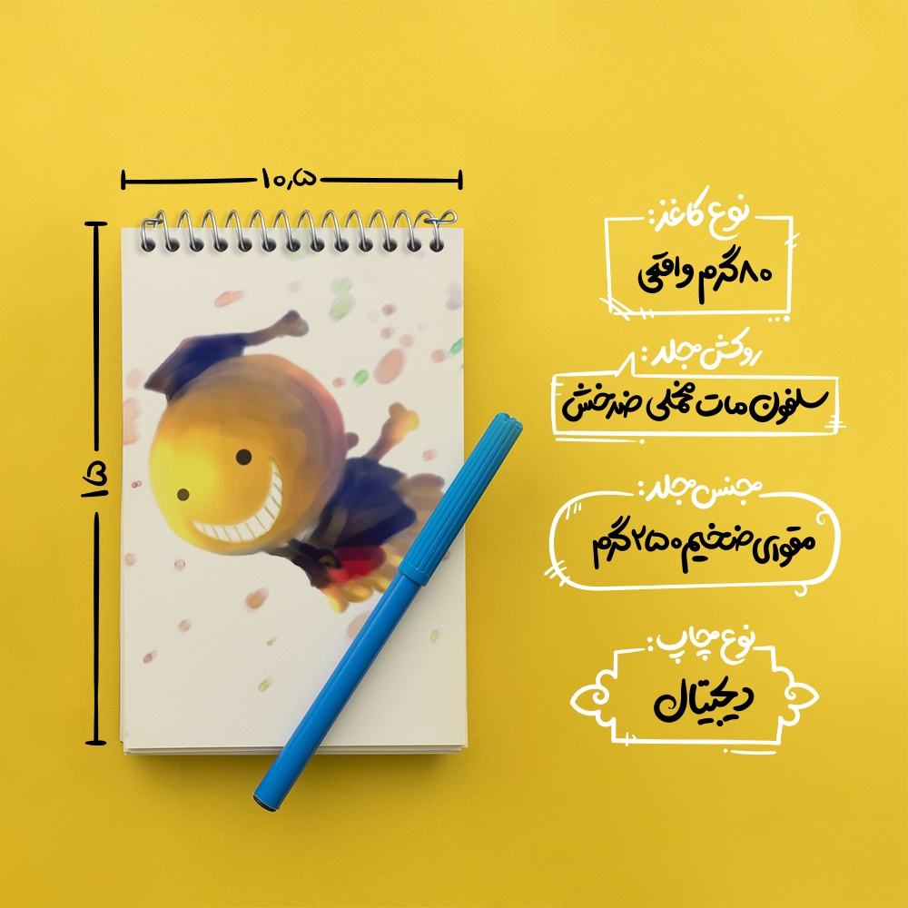 برند خندالو در زمینه تولید انواع دفاتر فانتزی و تحصیلی فعالیت میکند که به دلیل جذابیت ظاهری و طرح های متنوع طرفداران زیادی دارد. دفتر یادداشت خندالو طرح کورو سنسی انیمه کلاس آدمکشی محصولی مناسب برای همه عاشقان لوازم التحریر است و همچنین همه کسانی که بنا به موقعیت تحصیل یا شغلشان با دفتر و نوشت افزار زیاد سر و کار دارند. در تولید دفتر یادداشت خندالو طرح کورو سنسی انیمه کلاس آدمکشی از نوع صحافی فنر مارپیچ استفاده شده که در این نوع صحافی برگه‌ها به راحتی چرخیده و یا بیرون آورده می شوند.