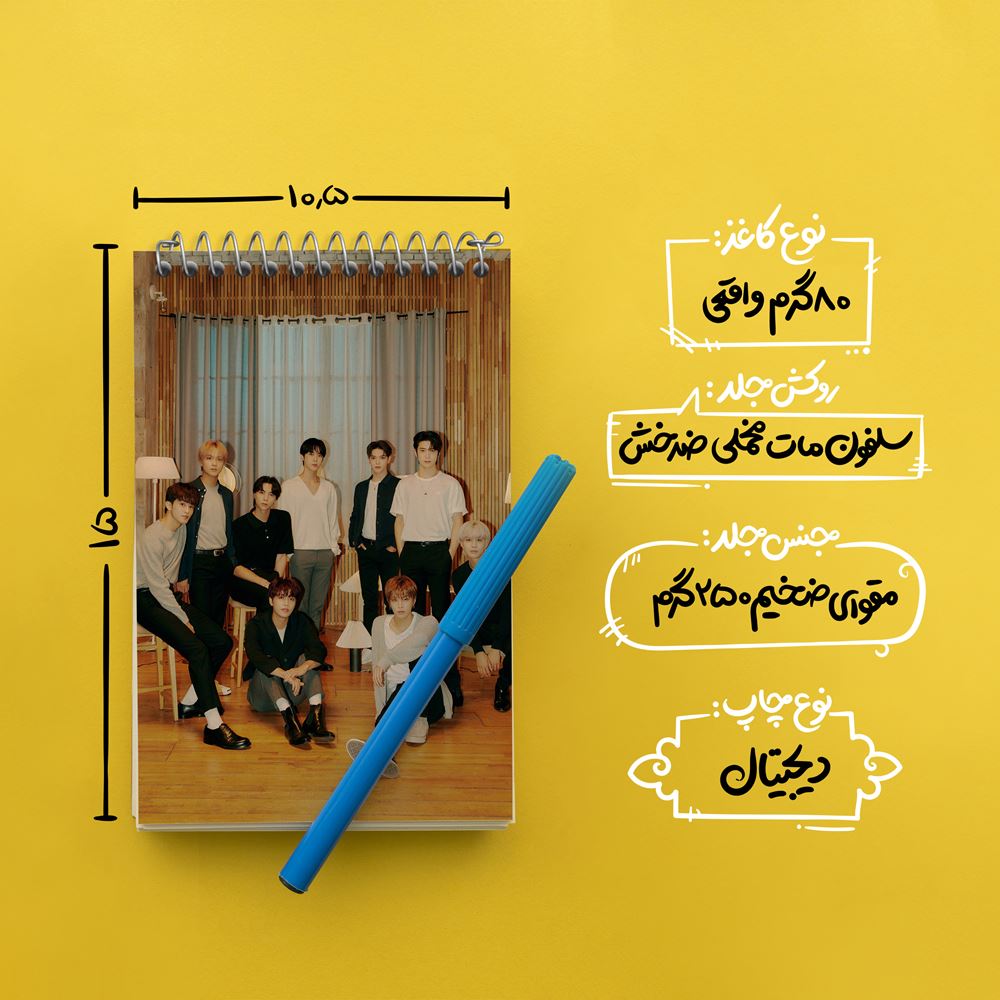 برند خندالو در زمینه تولید انواع دفاتر فانتزی و تحصیلی فعالیت میکند که به دلیل جذابیت ظاهری و طرح های متنوع طرفداران زیادی دارد. دفتر یادداشت خندالو طرح گروه ان سی تی NCT محصولی مناسب برای همه عاشقان لوازم التحریر است و همچنین همه کسانی که بنا به موقعیت تحصیل یا شغلشان با دفتر و نوشت افزار زیاد سر و کار دارند. در تولید دفتر یادداشت خندالو طرح گروه ان سی تی NCT از نوع صحافی فنر مارپیچ استفاده شده که در این نوع صحافی برگهها به راحتی چرخیده و یا بیرون آورده می شوند. دفتر های خندالو دارای جلد انعطاف پذیر از جنس مقوای گلاسه 250 گرم با روکش سلفون مات مخملی است که به شما امکان میدهد از دفتر خود بدون اینکه نگرانی از شکستن یا خراب شدن جلد را داشته باشید استفاده کنید و همچنین در این دفاتر از کاغذ 80 گرم با کیفیت استفاده شده که باعث میشود هنگام نوشتن به خوبی جوهر قلم بر روی صفحه نشسته و از خط خوردگیها جلوگیری کند. دفتر یادداشت خندالو با جنس و دوام مناسب، برگه های کاملاً سفید و خطوط طوسی دقیق را داراست که انسان را به نوشتن منظم و زیبا ترغیب میکند. طراحی کاملاً مناسب این دفاتر، به همراه کیفیت بالا، از آن یک محصول مورد علاقه و قابل اعتماد برای همه مقاطع تحصیلی میسازد. دفتر یادداشت خندالو طرح گروه ان سی تی NCT انتخابی هوشمندانه و مناسب برای افرادی است که به دنبال دفتری با کیفیت و کاربرد عالی هستند. این دفتر، همراه خوبی برای شما در تمام مراحل تحصیل و کار خواهد بود و تجربهای لذتبخش از نوشتن و آموختن را به شما هدیه میدهد.