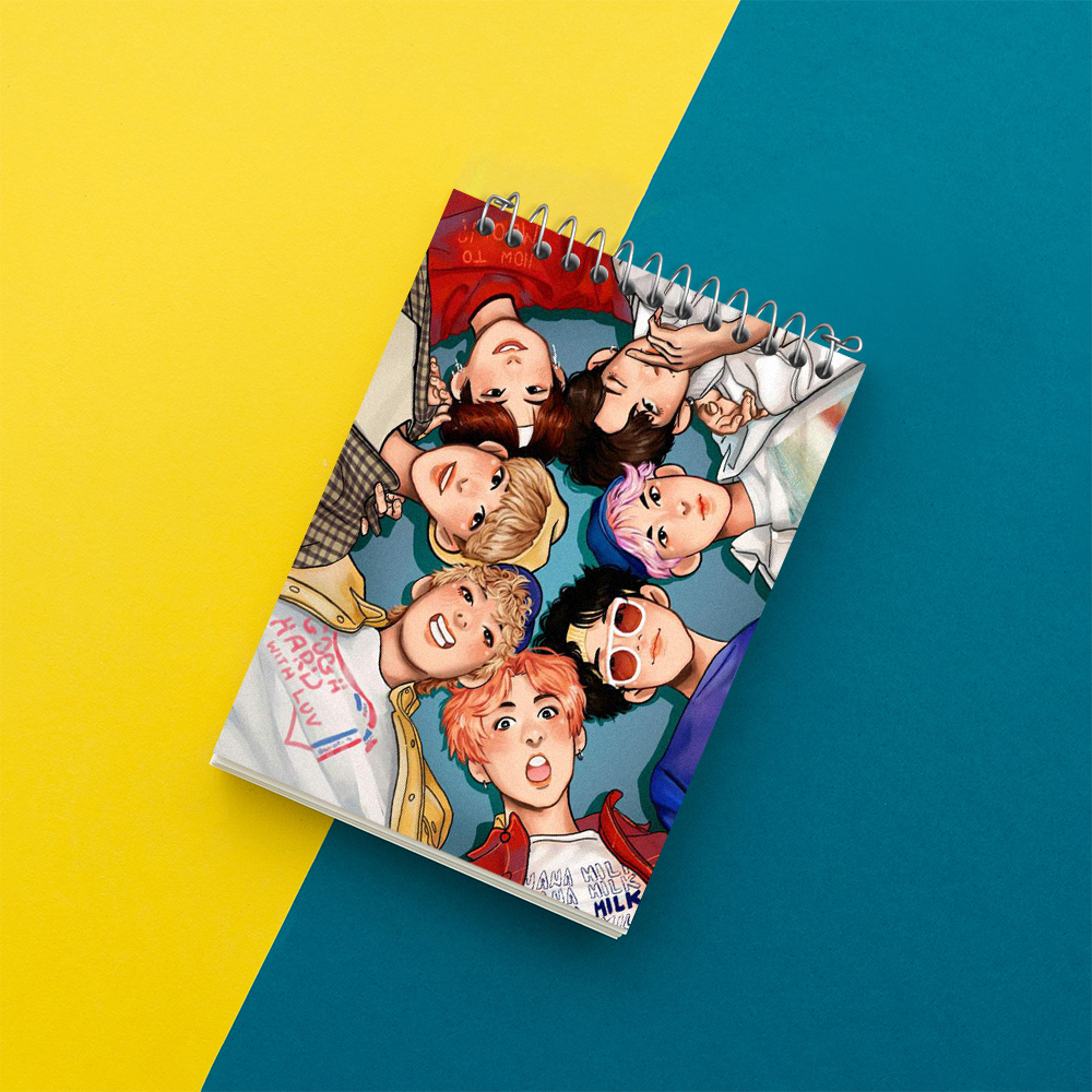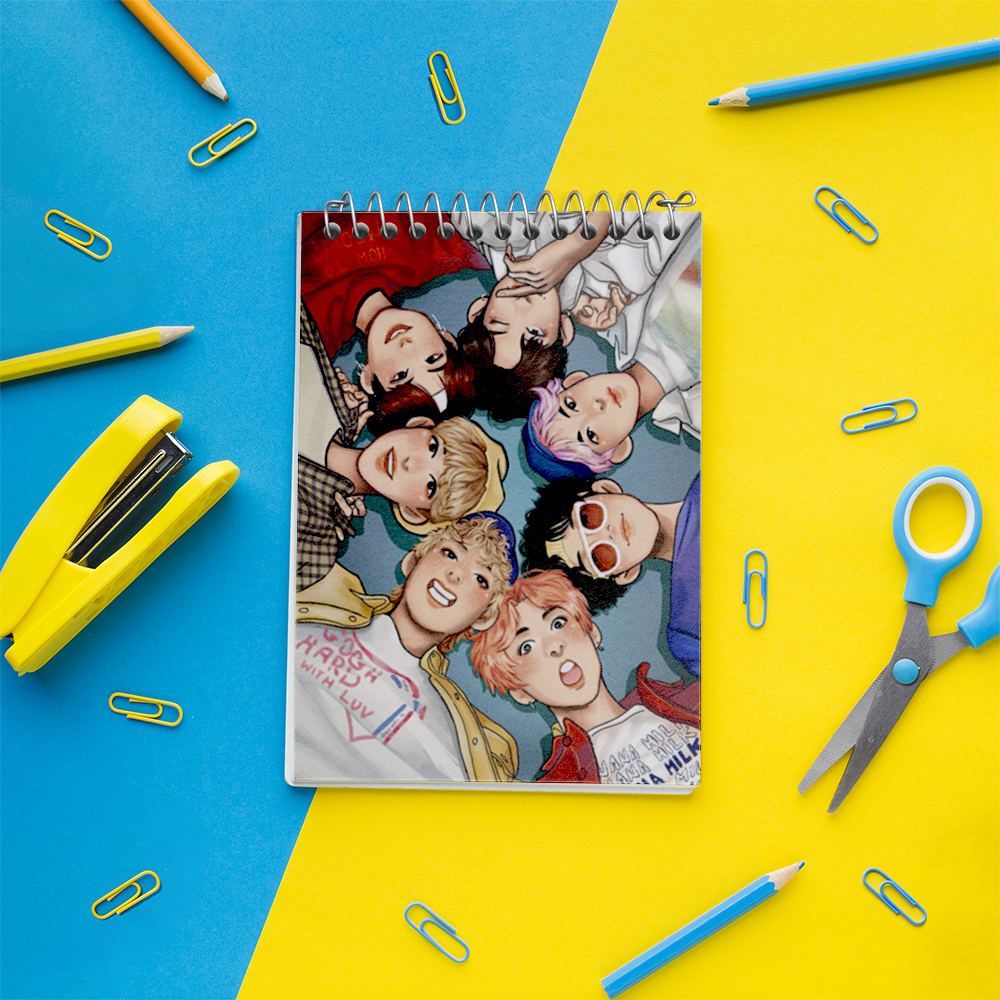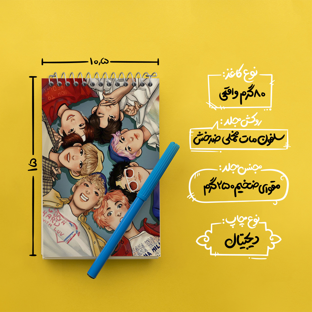 برند خندالو در زمینه تولید انواع دفاتر فانتزی و تحصیلی فعالیت میکند که به دلیل جذابیت ظاهری و طرح های متنوع طرفداران زیادی دارد. دفتر یادداشت خندالو طرح گروه بی تی اس BTS محصولی مناسب برای همه عاشقان لوازم التحریر است و همچنین همه کسانی که بنا به موقعیت تحصیل یا شغلشان با دفتر و نوشت افزار زیاد سر و کار دارند. در تولید دفتر یادداشت خندالو طرح گروه بی تی اس BTS از نوع صحافی فنر مارپیچ استفاده شده که در این نوع صحافی برگه‌ها به راحتی چرخیده و یا بیرون آورده می شوند.