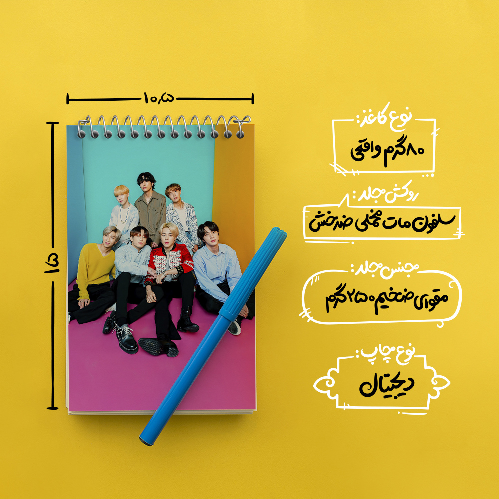 برند خندالو در زمینه تولید انواع دفاتر فانتزی و تحصیلی فعالیت میکند که به دلیل جذابیت ظاهری و طرح های متنوع طرفداران زیادی دارد. دفتر یادداشت خندالو طرح گروه بی تی اس BTS محصولی مناسب برای همه عاشقان لوازم التحریر است و همچنین همه کسانی که بنا به موقعیت تحصیل یا شغلشان با دفتر و نوشت افزار زیاد سر و کار دارند. در تولید دفتر یادداشت خندالو طرح گروه بی تی اس BTS از نوع صحافی فنر مارپیچ استفاده شده که در این نوع صحافی برگه‌ها به راحتی چرخیده و یا بیرون آورده می شوند.