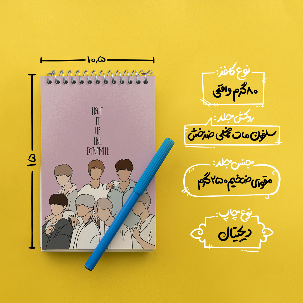 برند خندالو در زمینه تولید انواع دفاتر فانتزی و تحصیلی فعالیت میکند که به دلیل جذابیت ظاهری و طرح های متنوع طرفداران زیادی دارد. دفتر یادداشت خندالو طرح گروه بی تی اس BTS محصولی مناسب برای همه عاشقان لوازم التحریر است و همچنین همه کسانی که بنا به موقعیت تحصیل یا شغلشان با دفتر و نوشت افزار زیاد سر و کار دارند. در تولید دفتر یادداشت خندالو طرح گروه بی تی اس BTS از نوع صحافی فنر مارپیچ استفاده شده که در این نوع صحافی برگه‌ها به راحتی چرخیده و یا بیرون آورده می شوند.