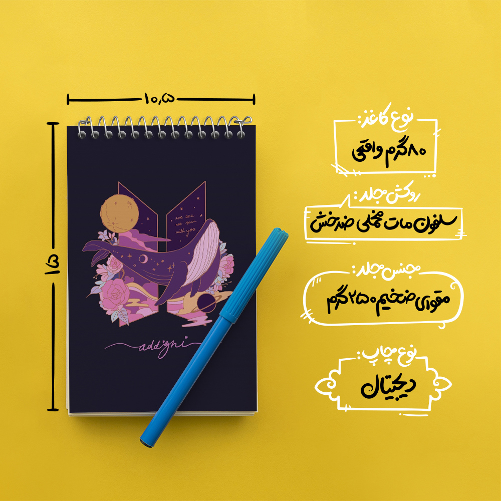 برند خندالو در زمینه تولید انواع دفاتر فانتزی و تحصیلی فعالیت میکند که به دلیل جذابیت ظاهری و طرح های متنوع طرفداران زیادی دارد. دفتر یادداشت خندالو طرح گروه بی تی اس BTS محصولی مناسب برای همه عاشقان لوازم التحریر است و همچنین همه کسانی که بنا به موقعیت تحصیل یا شغلشان با دفتر و نوشت افزار زیاد سر و کار دارند. در تولید دفتر یادداشت خندالو طرح گروه بی تی اس BTS از نوع صحافی فنر مارپیچ استفاده شده که در این نوع صحافی برگه‌ها به راحتی چرخیده و یا بیرون آورده می شوند.