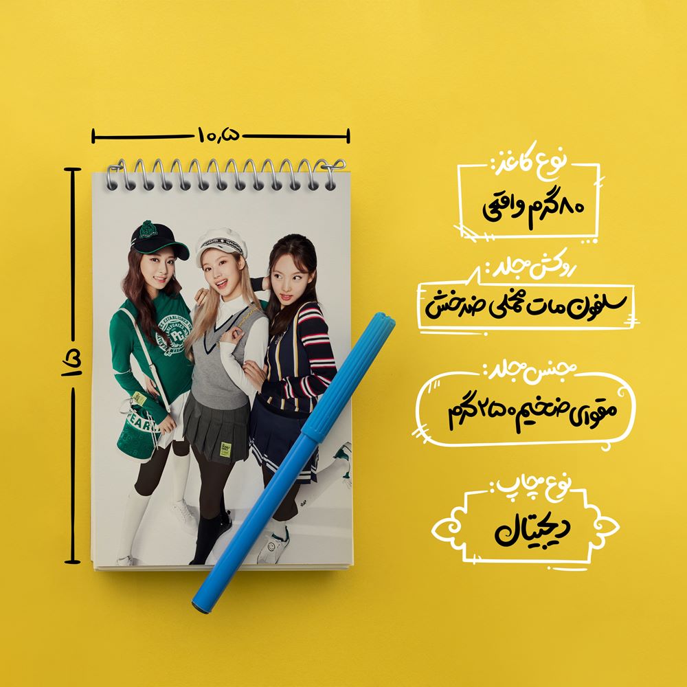 برند خندالو در زمینه تولید انواع دفاتر فانتزی و تحصیلی فعالیت میکند که به دلیل جذابیت ظاهری و طرح های متنوع طرفداران زیادی دارد. دفتر یادداشت خندالو طرح گروه توایس TWICE محصولی مناسب برای همه عاشقان لوازم التحریر است و همچنین همه کسانی که بنا به موقعیت تحصیل یا شغلشان با دفتر و نوشت افزار زیاد سر و کار دارند. در تولید دفتر یادداشت خندالو طرح گروه توایس TWICE از نوع صحافی فنر مارپیچ استفاده شده که در این نوع صحافی برگه‌ها به راحتی چرخیده و یا بیرون آورده می شوند.