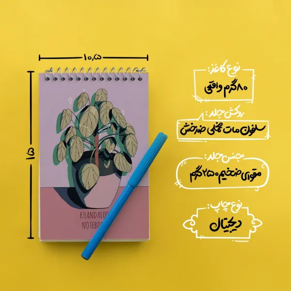 برند خندالو در زمینه تولید انواع دفاتر فانتزی و تحصیلی فعالیت میکند که به دلیل جذابیت ظاهری و طرح های متنوع طرفداران زیادی دارد. دفتر یادداشت خندالو طرح گلدان گیاه محصولی مناسب برای همه عاشقان لوازم التحریر است و همچنین همه کسانی که بنا به موقعیت تحصیل یا شغلشان با دفتر و نوشت افزار زیاد سر و کار دارند. در تولید دفتر یادداشت خندالو طرح گلدان گیاه از نوع صحافی فنر مارپیچ استفاده شده که در این نوع صحافی برگهها به راحتی چرخیده و یا بیرون آورده می شوند. دفتر های خندالو دارای جلد انعطاف پذیر از جنس مقوای گلاسه 250 گرم با روکش سلفون مات مخملی است که به شما امکان میدهد از دفتر خود بدون اینکه نگرانی از شکستن یا خراب شدن جلد را داشته باشید استفاده کنید و همچنین در این دفاتر از کاغذ 80 گرم با کیفیت استفاده شده که باعث میشود هنگام نوشتن به خوبی جوهر قلم بر روی صفحه نشسته و از خط خوردگیها جلوگیری کند. دفتر یادداشت خندالو با جنس و دوام مناسب، برگه های کاملاً سفید و خطوط طوسی دقیق را داراست که انسان را به نوشتن منظم و زیبا ترغیب میکند. طراحی کاملاً مناسب این دفاتر، به همراه کیفیت بالا، از آن یک محصول مورد علاقه و قابل اعتماد برای همه مقاطع تحصیلی میسازد. دفتر یادداشت خندالو طرح گلدان گیاه انتخابی هوشمندانه و مناسب برای افرادی است که به دنبال دفتری با کیفیت و کاربرد عالی هستند. این دفتر، همراه خوبی برای شما در تمام مراحل تحصیل و کار خواهد بود و تجربهای لذتبخش از نوشتن و آموختن را به شما هدیه میدهد.